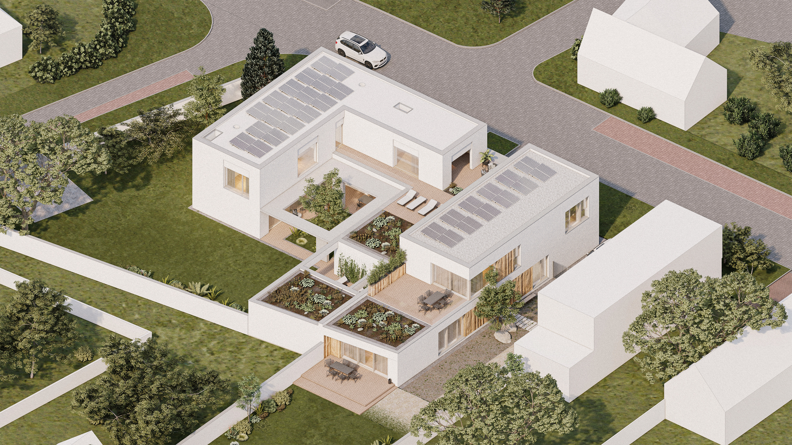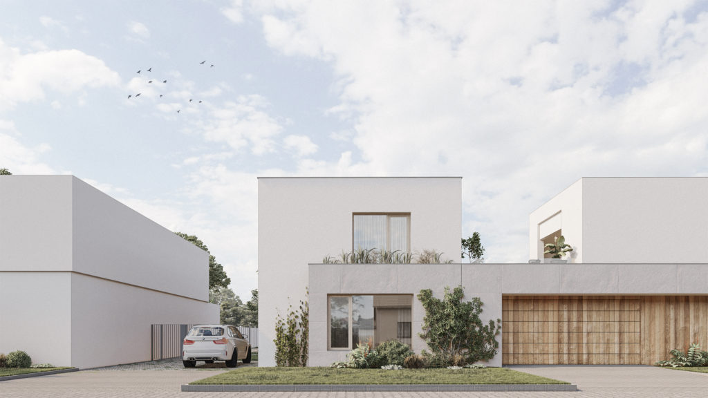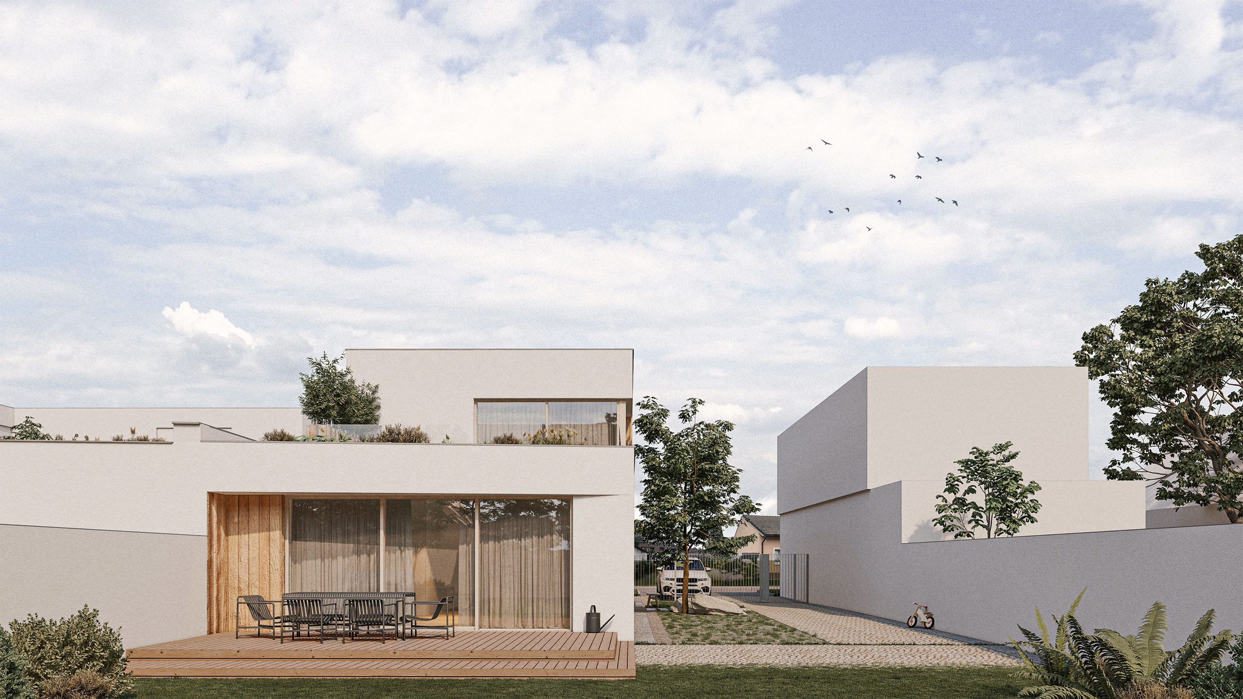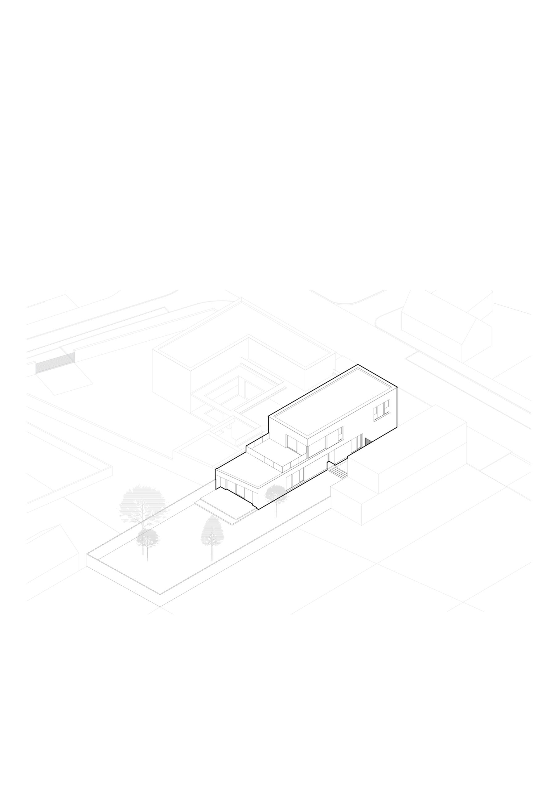 The façade of the house follows the street line, while the garden-facing side connects to the neighboring building at the ground floor and recedes at the upper floor to create space for a terrace. The house also defines a portion of the garden next to the main side façade, which will be designed primarily as a utility area.