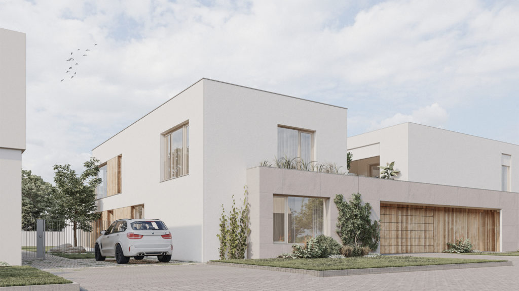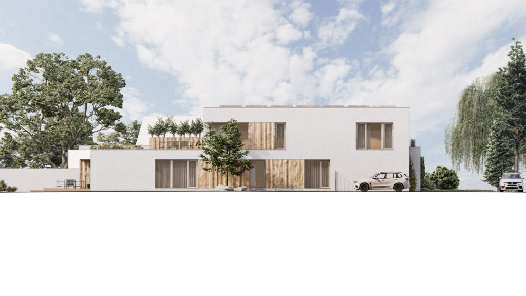 A two-story annex located right next to our previous design, villa Radonice, for the same client. Compared to the neighboring building, the mass of the new house is an elongated rectangle, but it borrows and utilizes the generous materiality of the adjacent object in a slightly modified form. The architectural language and volumetric solution are influenced not only by our previous design but also by the surrounding existing buildings and the existing demolished structure.