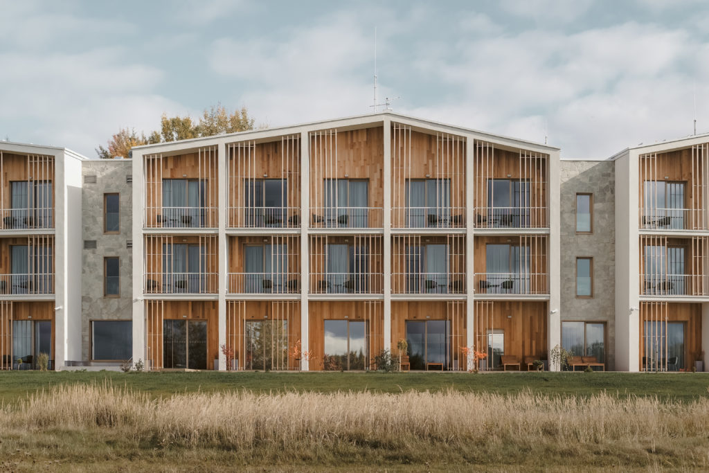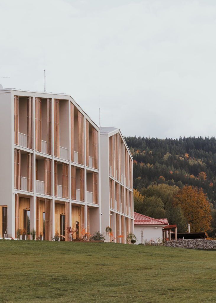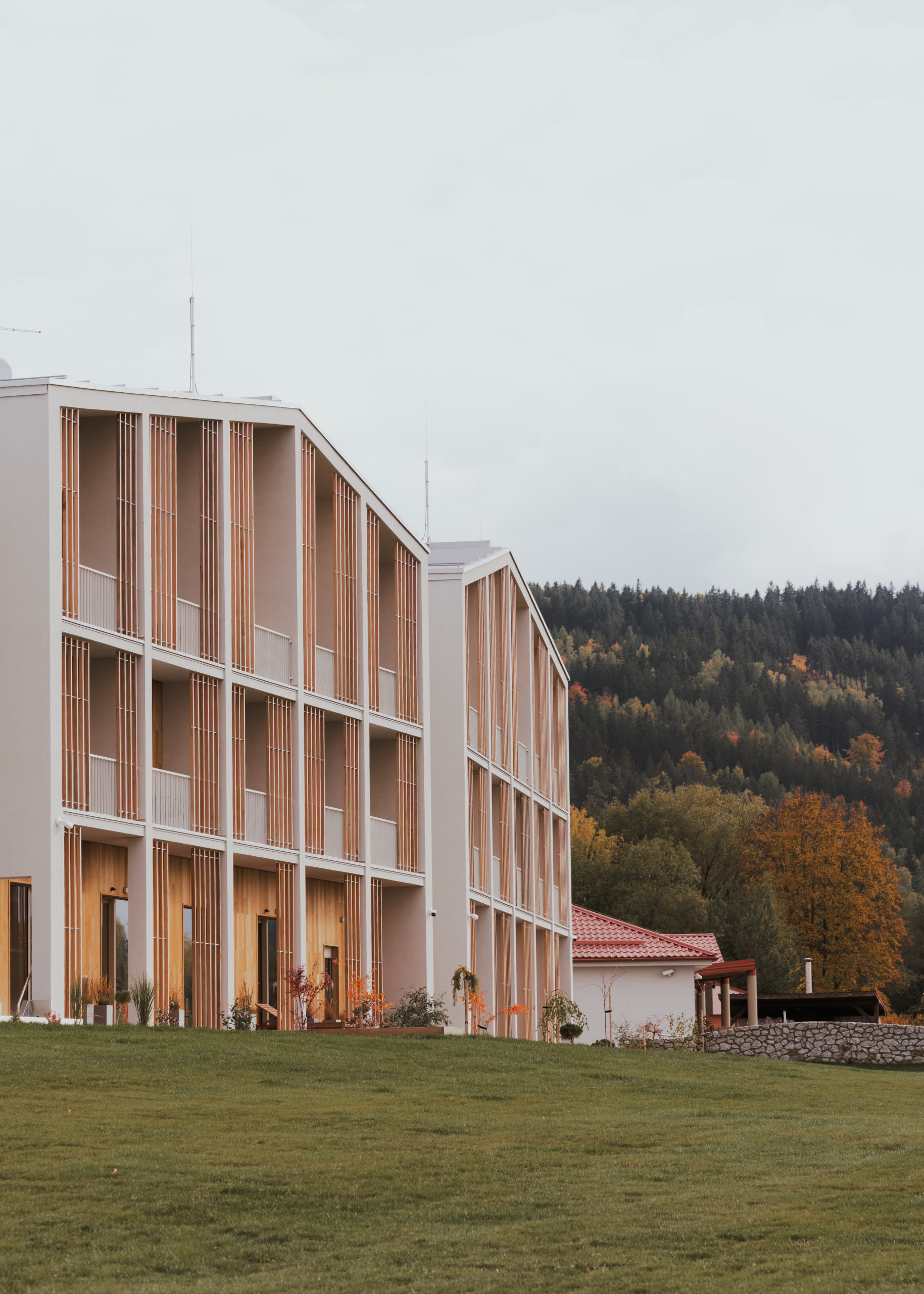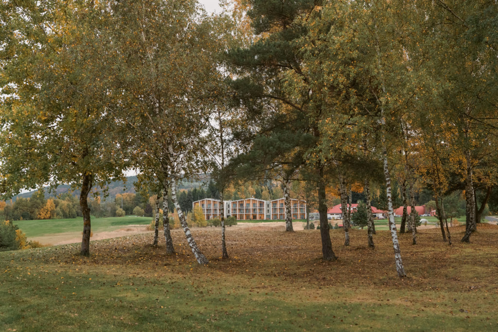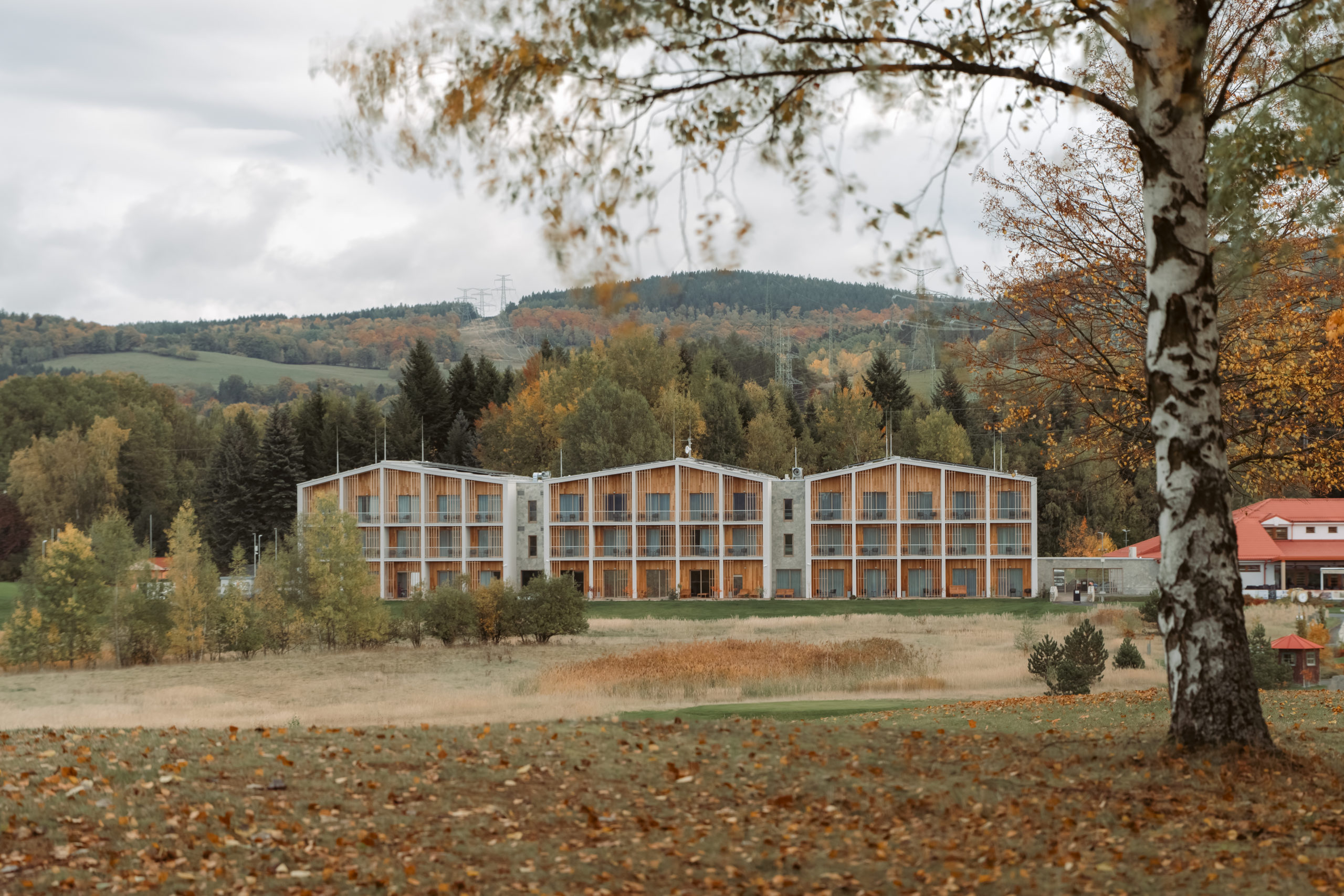 The golf hotel in Sokolov is designed to blend naturally into the surrounding landscape. Three interconnected volumes follow the course of a stream, creating a seamless link between the golf course and the hotel. Each building has a gable roof and a red cedar façade, complemented by stone cladding that references local materials.