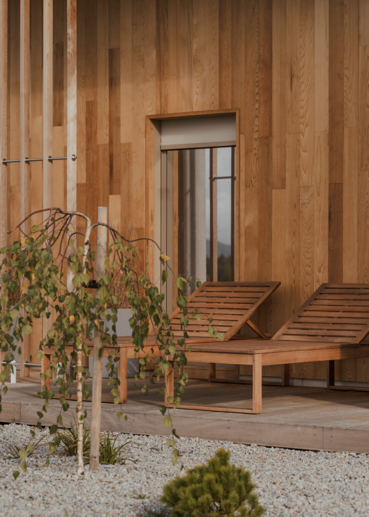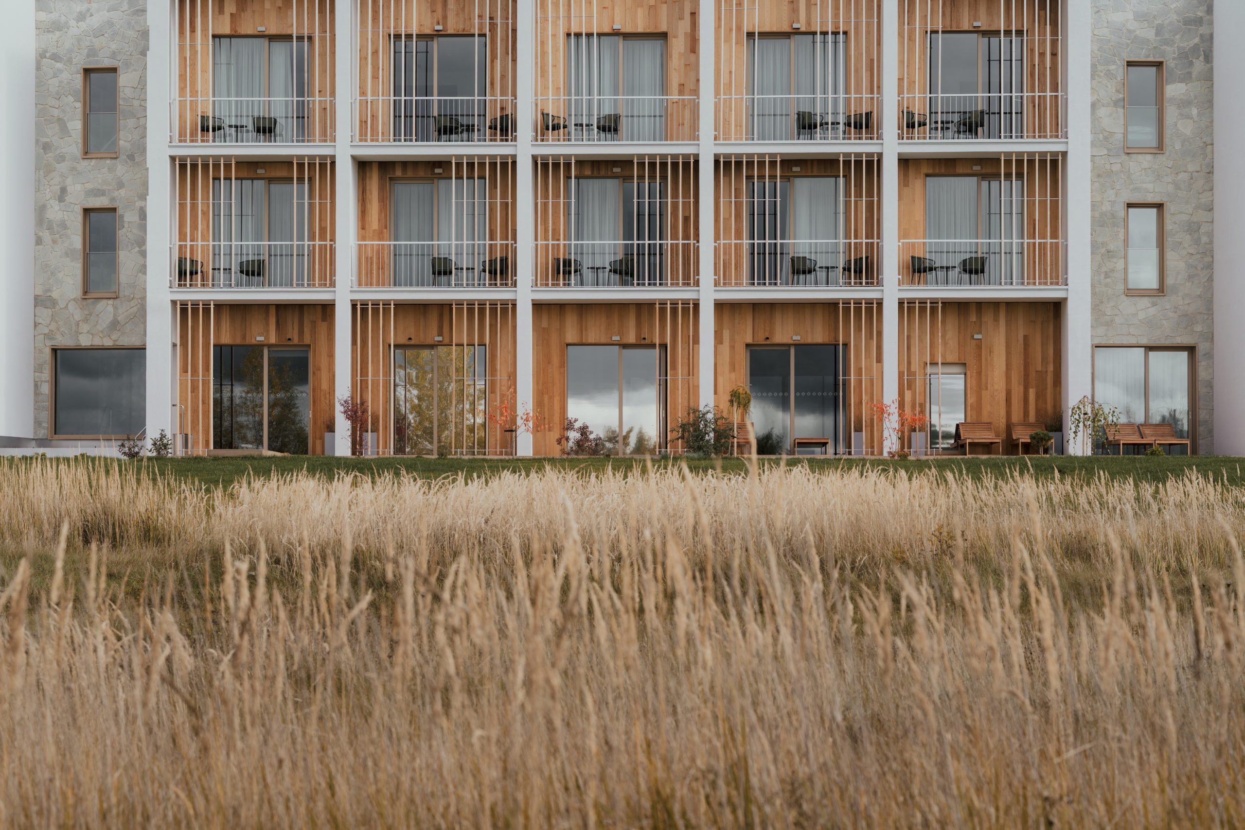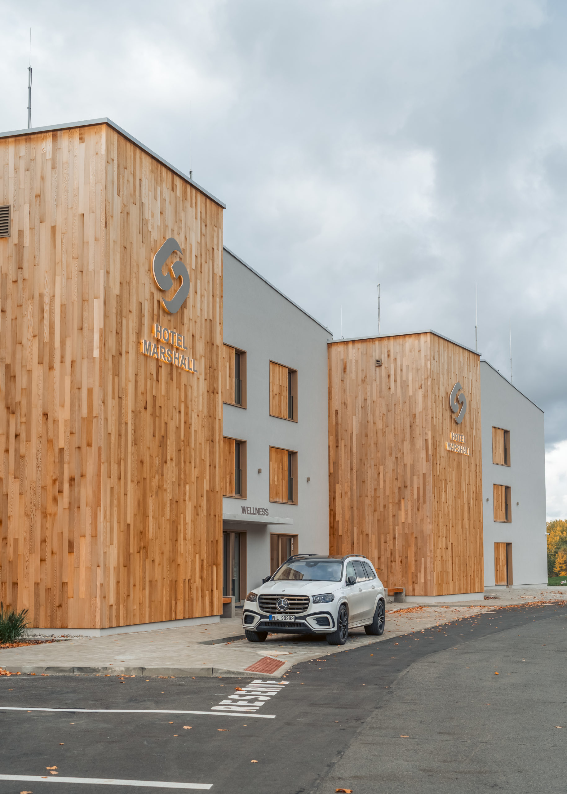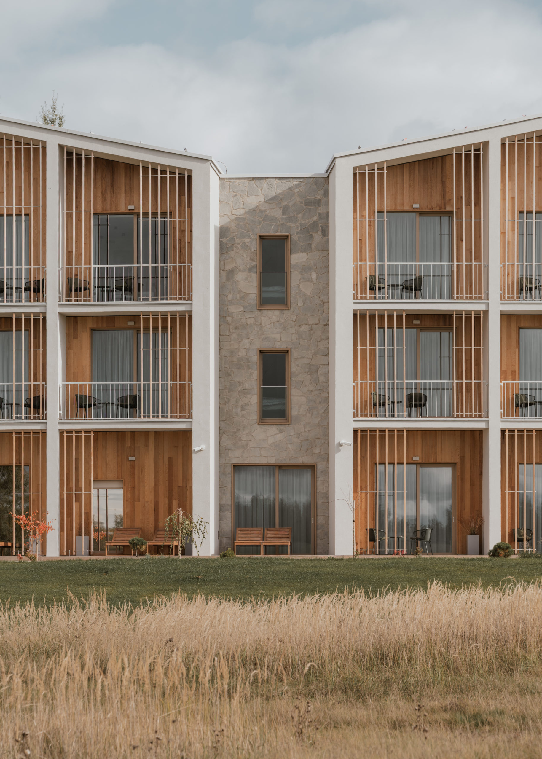 The golf hotel in Sokolov is designed to blend naturally into the surrounding landscape. Three interconnected volumes follow the course of a stream, creating a seamless link between the golf course and the hotel. Each building has a gable roof and a red cedar façade, complemented by stone cladding that references local materials.