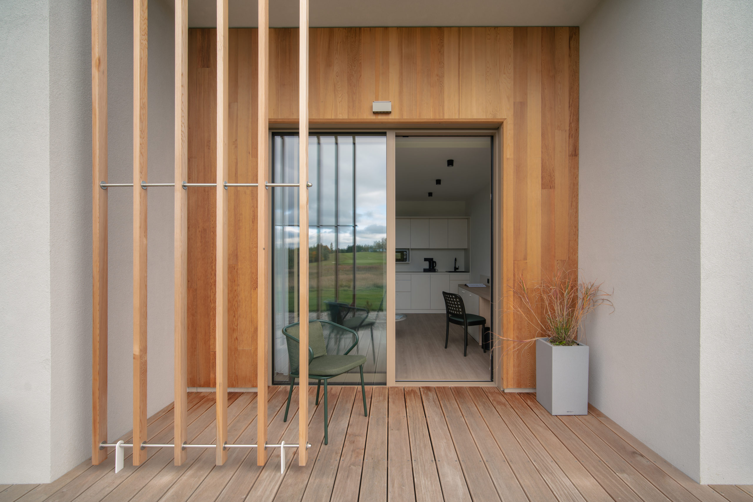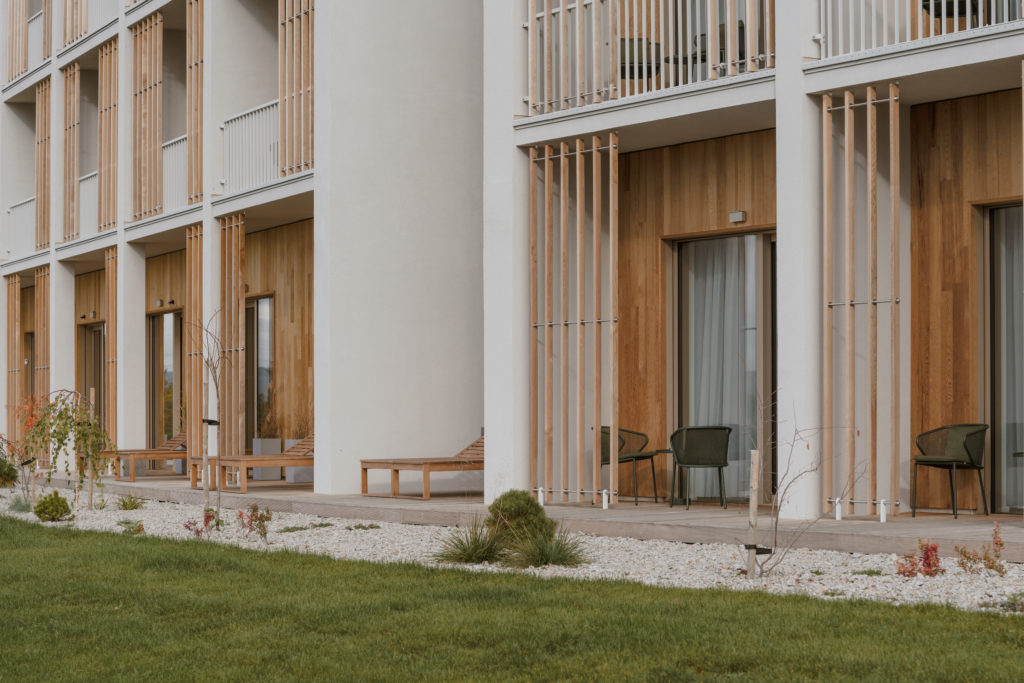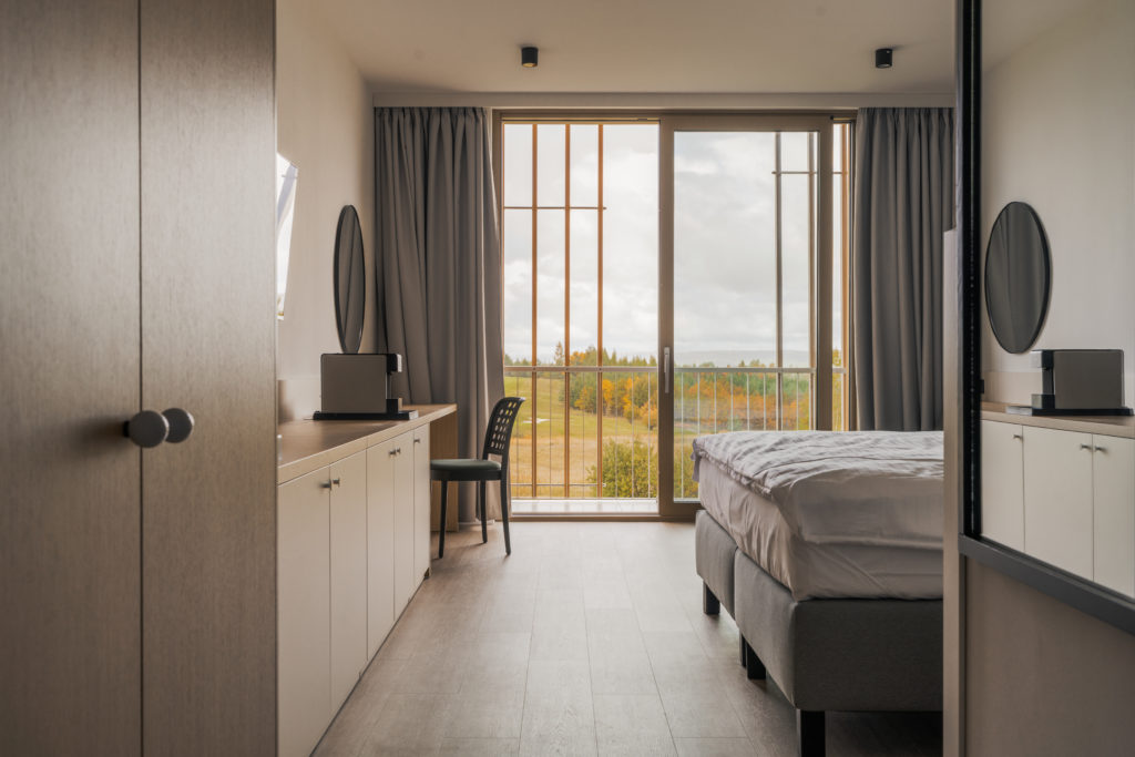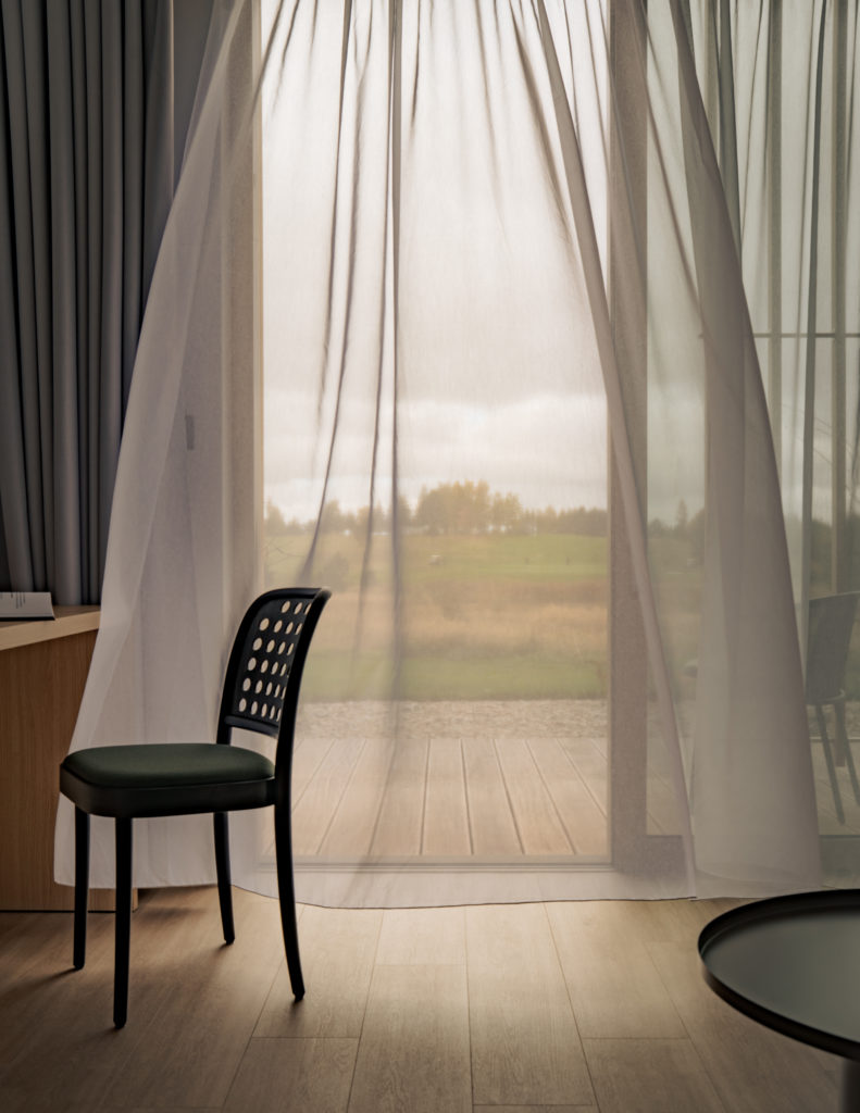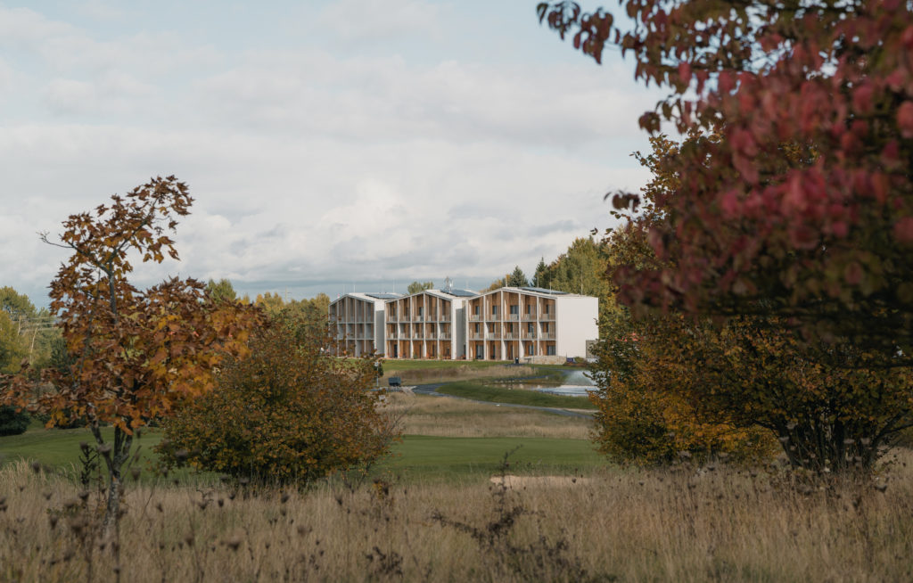 The interior combines the standard of a comfortable hotel with the relaxed atmosphere of a sports setting. All rooms and shared spaces face the course and make use of natural materials, a subtle color palette, and carefully considered lighting. The accommodation area is complemented by a modest wellness zone that enhances overall comfort. In addition, the hotel’s operation is made more sustainable through an energy-efficient system for heating, cooling, and heat recovery (ventilation).