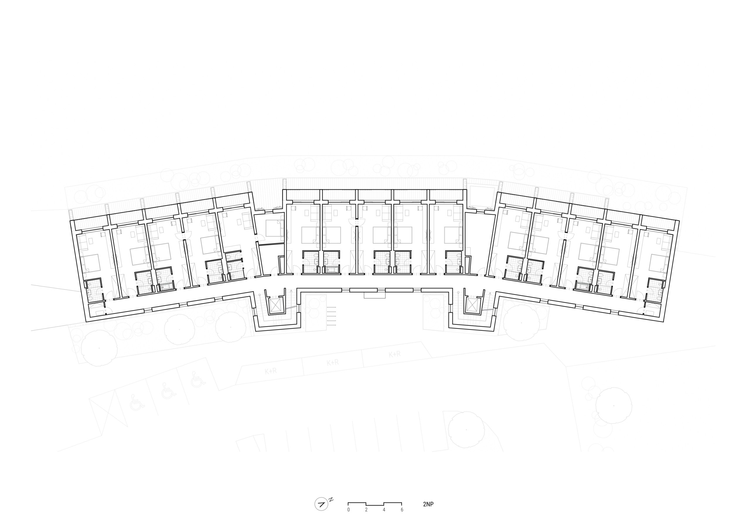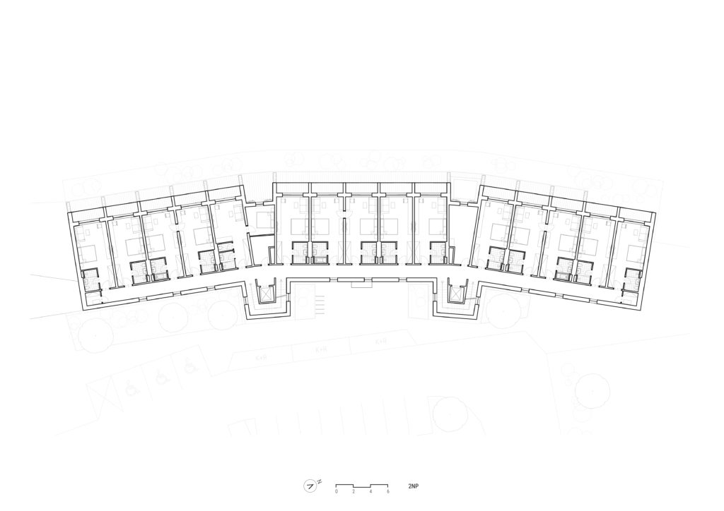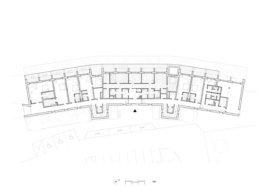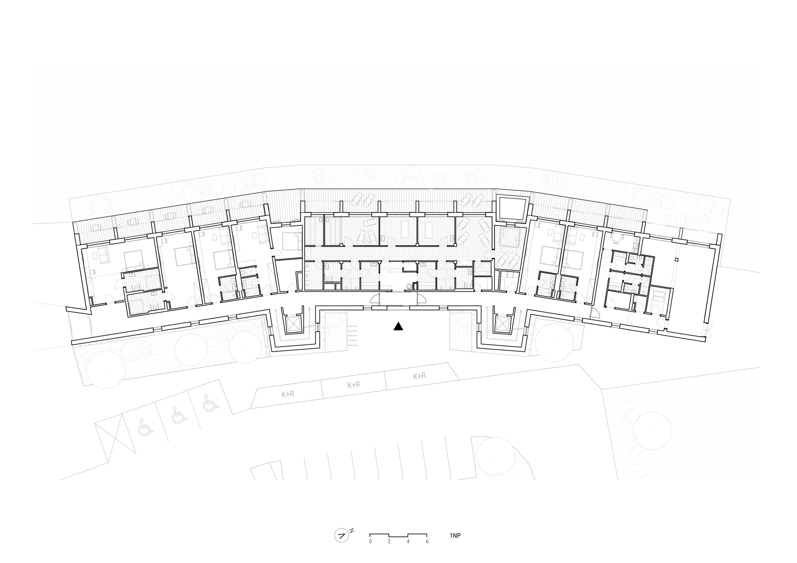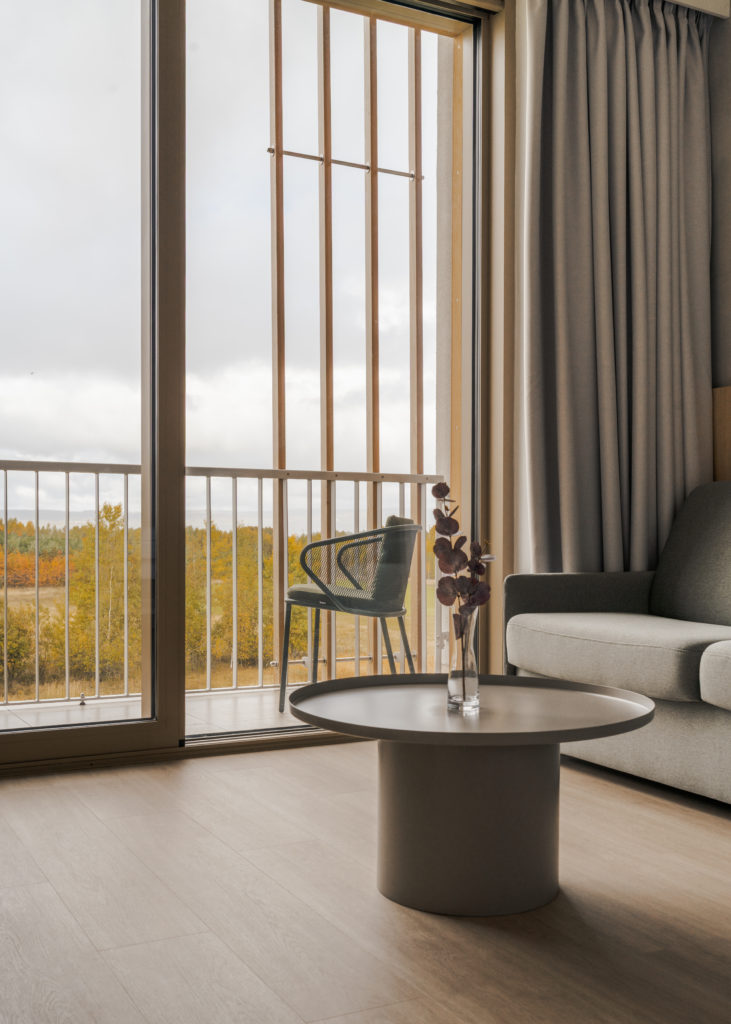 The interior combines the standard of a comfortable hotel with the relaxed atmosphere of a sports setting. All rooms and shared spaces face the course and make use of natural materials, a subtle color palette, and carefully considered lighting. The accommodation area is complemented by a modest wellness zone that enhances overall comfort. In addition, the hotel’s operation is made more sustainable through an energy-efficient system for heating, cooling, and heat recovery (ventilation).