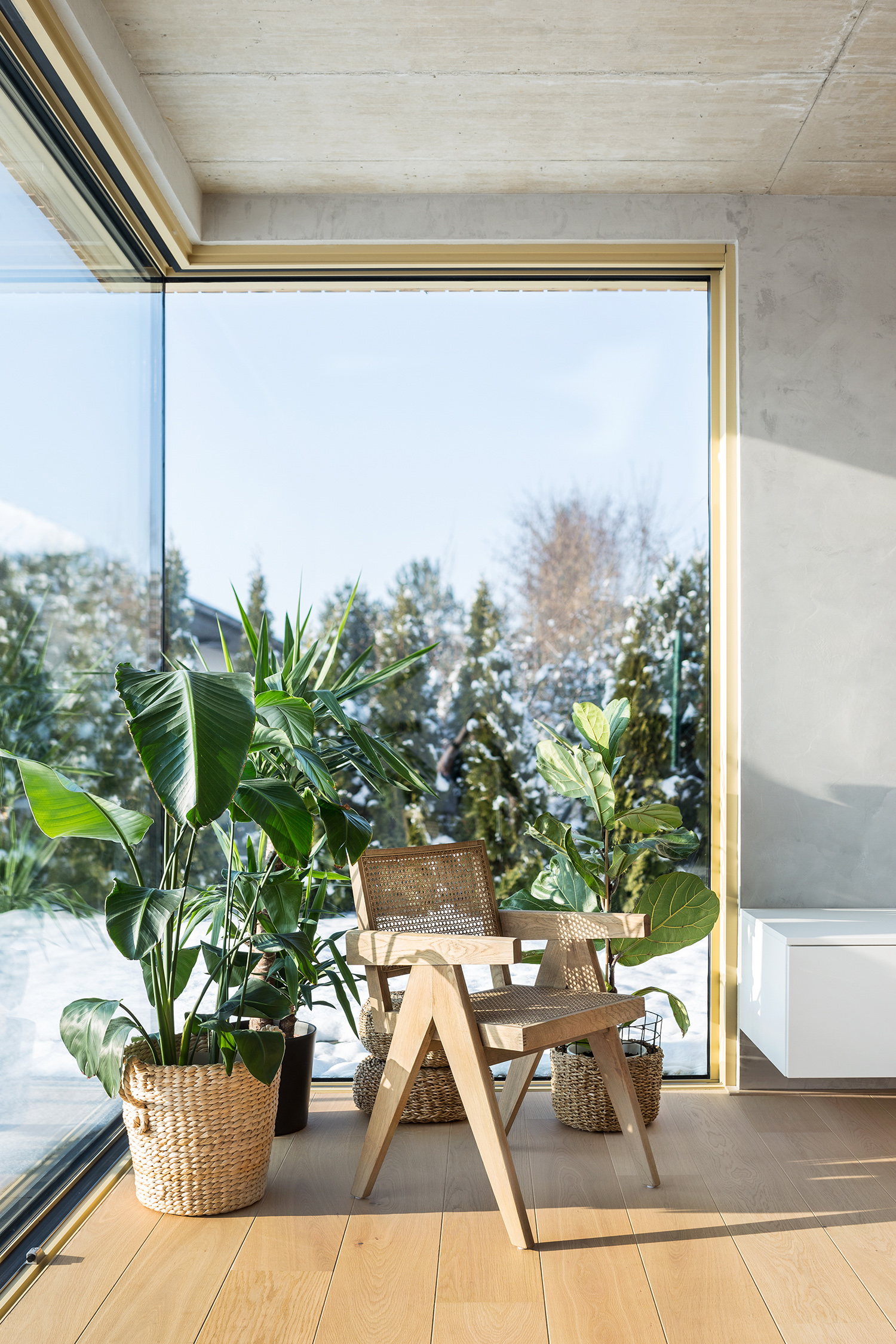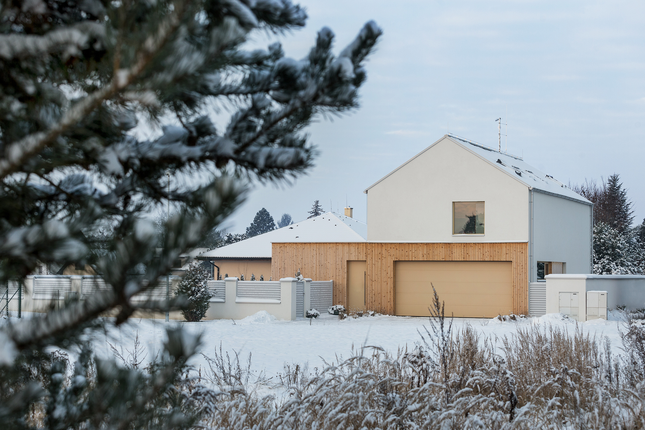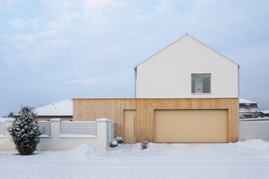 Construction of the villa, based on our design in collaboration with the design studio BÍZEK PROJEKT s.r.o., represents a harmonious blend of modernity and tradition. The assignment called for a modern villa with a traditional morphology, specifically featuring a gable roof. To achieve a contemporary aesthetic, we combined elements of the traditional gable roof with a low flat building featuring wooden cladding. The ground floor of the villa boasts a spacious living room, serving as the heart of the home, alongside an integrated double garage for convenient access to the property. On the upper floor, privacy is paramount, with a dedicated parents’ wing comprising a bedroom, walk-in closet, and private bathroom, as well as two children’s rooms with a separate bathroom. Externally, the villa is characterized by cedar clapboard siding, white plaster, and understated grey cladding and roofing. These materials and colour palette are subsequently repeated in the interior, which is presented as a separate realisation.