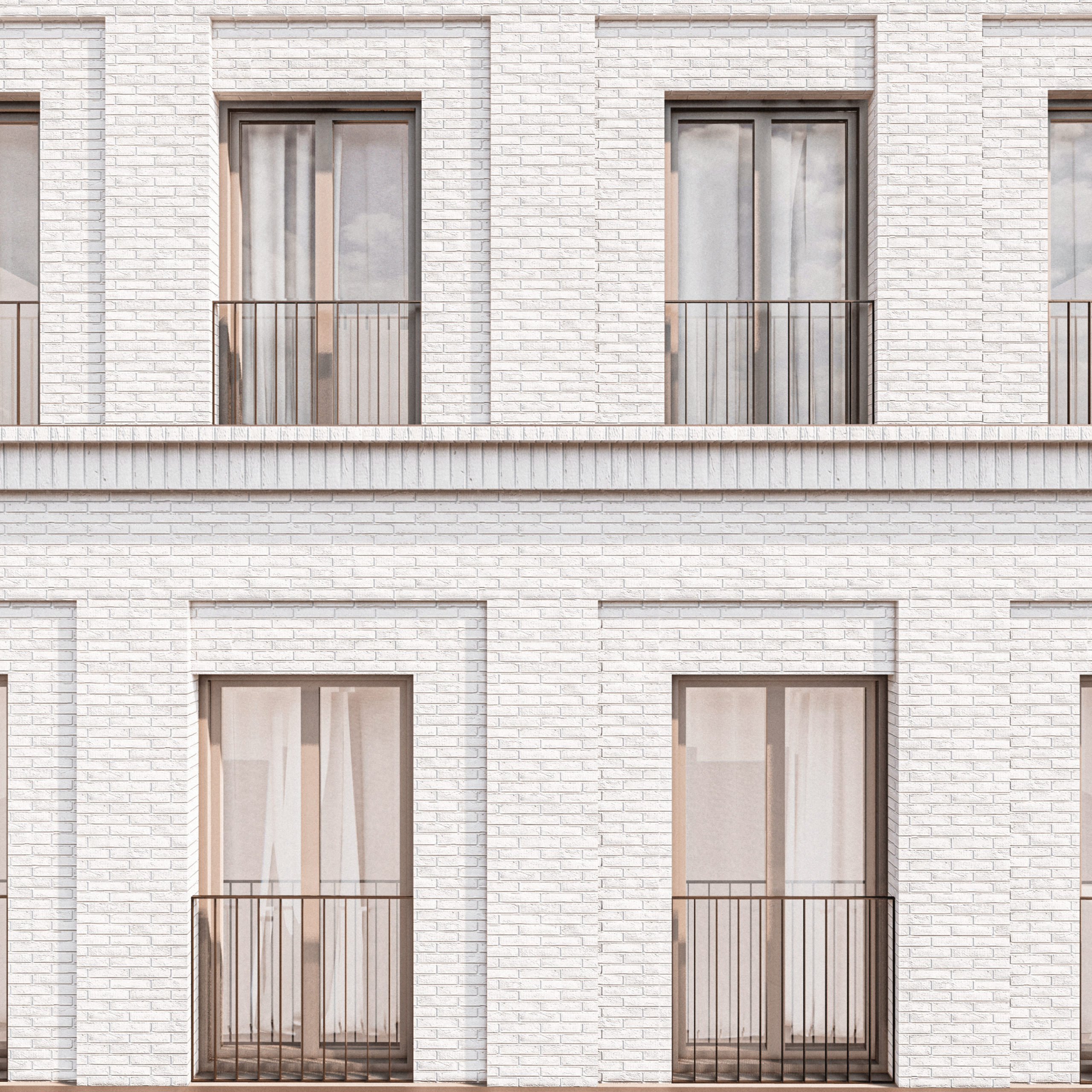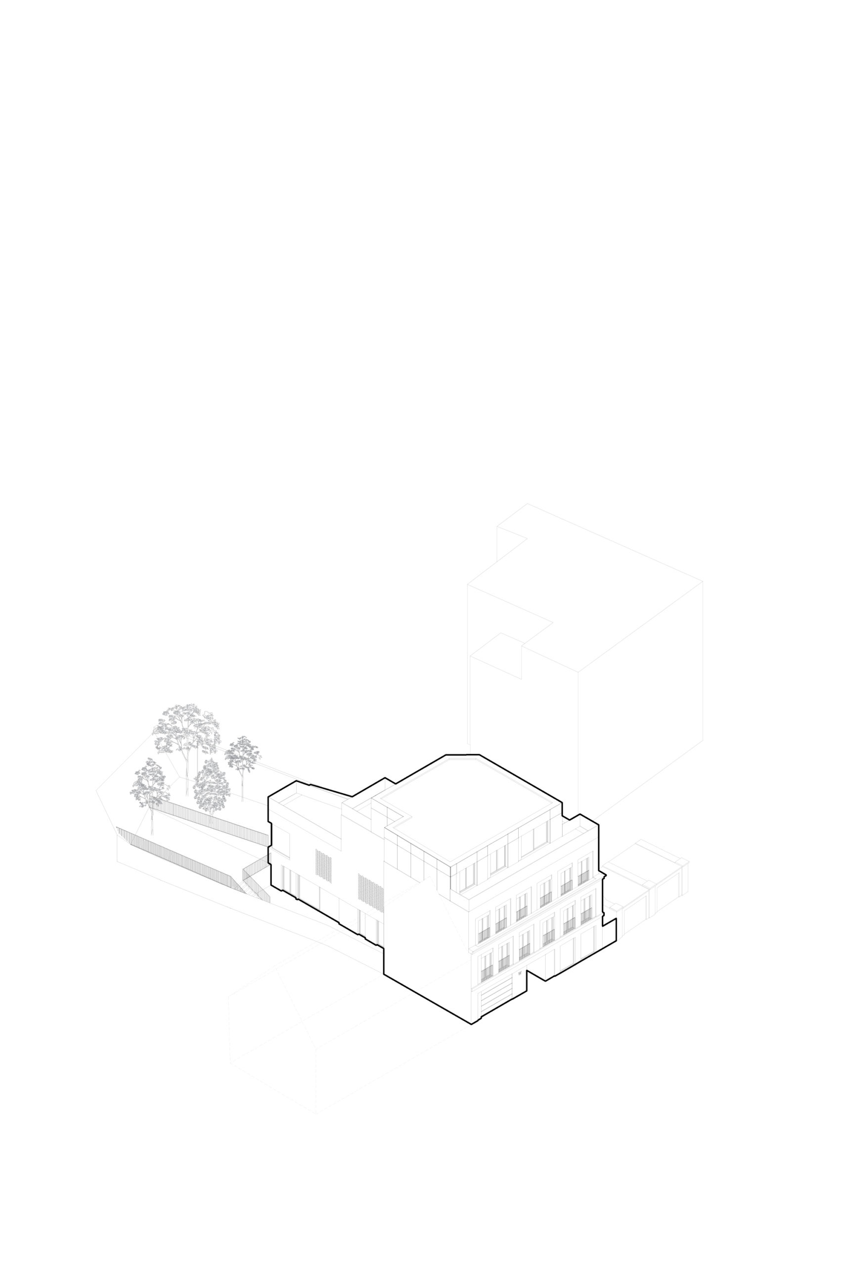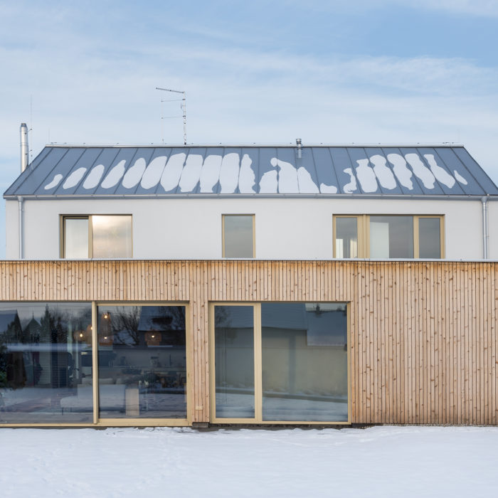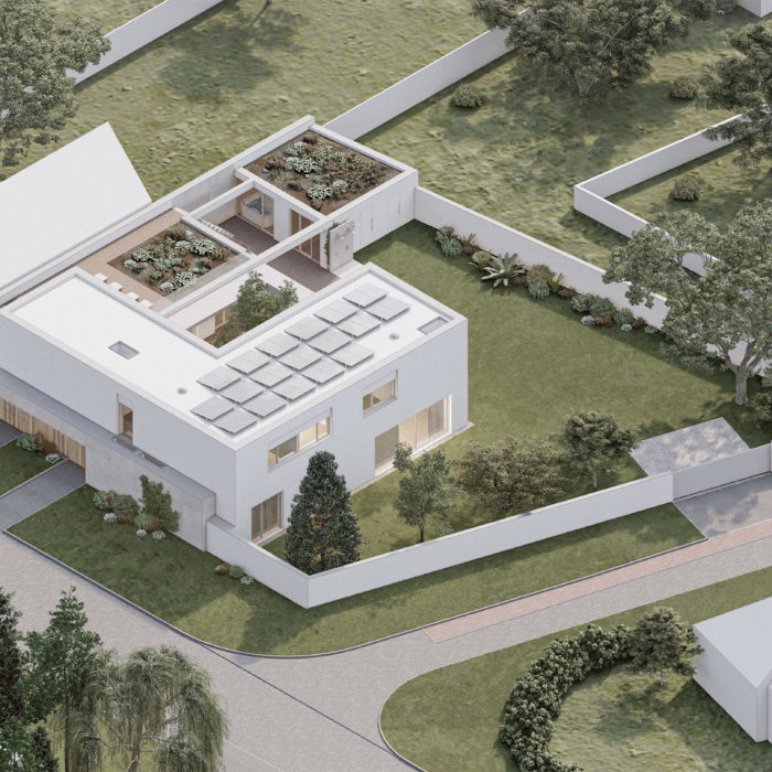 The façade is made of light-colored brick, complemented by metal cladding on the recessed upper floor and the garage. The simple volume is balanced by precise detailing and scaled articulation that responds to the surrounding context. The proposal was strongly shaped by constraints—from parking requirements to its location within the protection zone of a heritage conservation area, as well as specific relationships to neighboring plots. The result is contemporary architecture sensitively inserted into a complex setting.