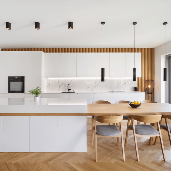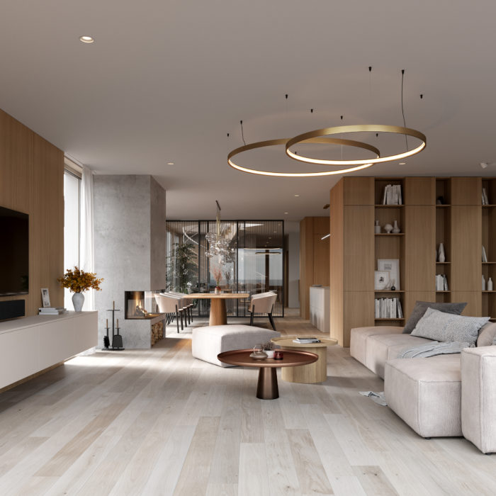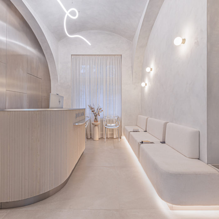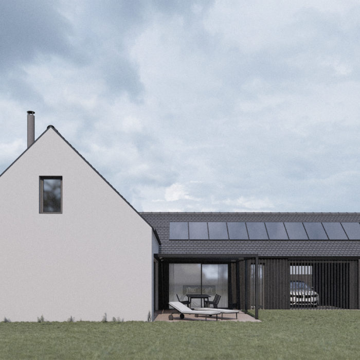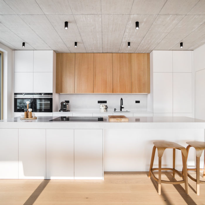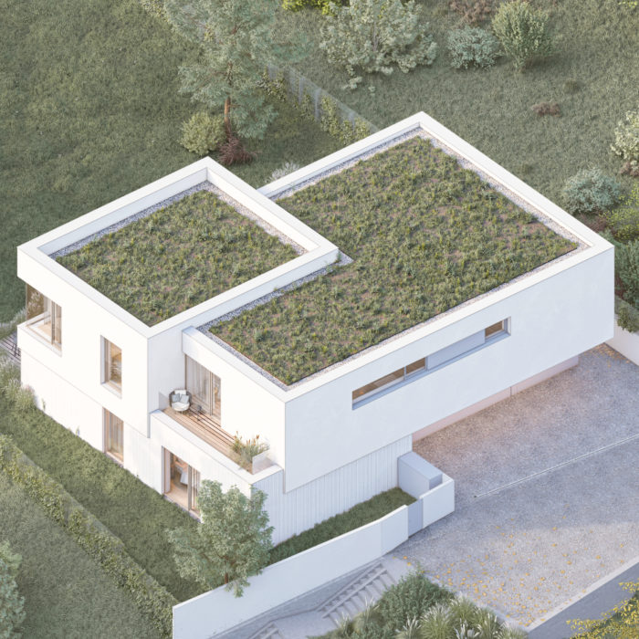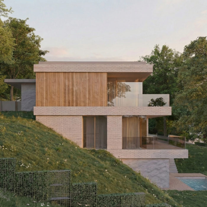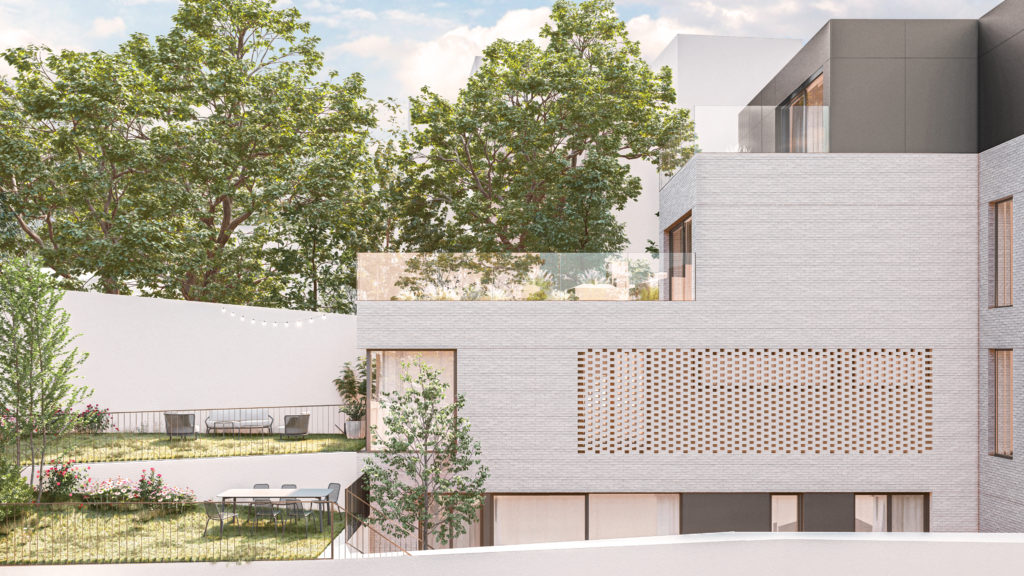 The façade is made of light-colored brick, complemented by metal cladding on the recessed upper floor and the garage. The simple volume is balanced by precise detailing and scaled articulation that responds to the surrounding context. The proposal was strongly shaped by constraints—from parking requirements to its location within the protection zone of a heritage conservation area, as well as specific relationships to neighboring plots. The result is contemporary architecture sensitively inserted into a complex setting.