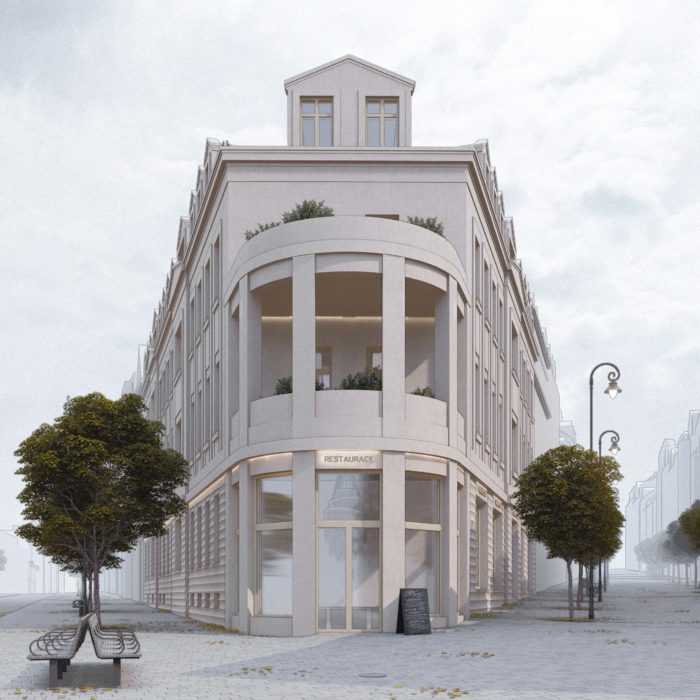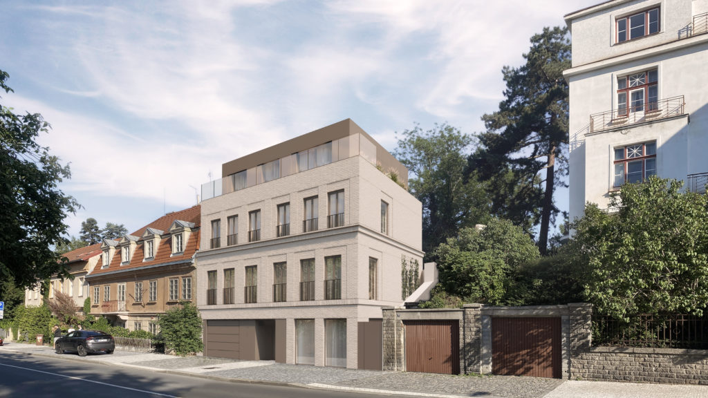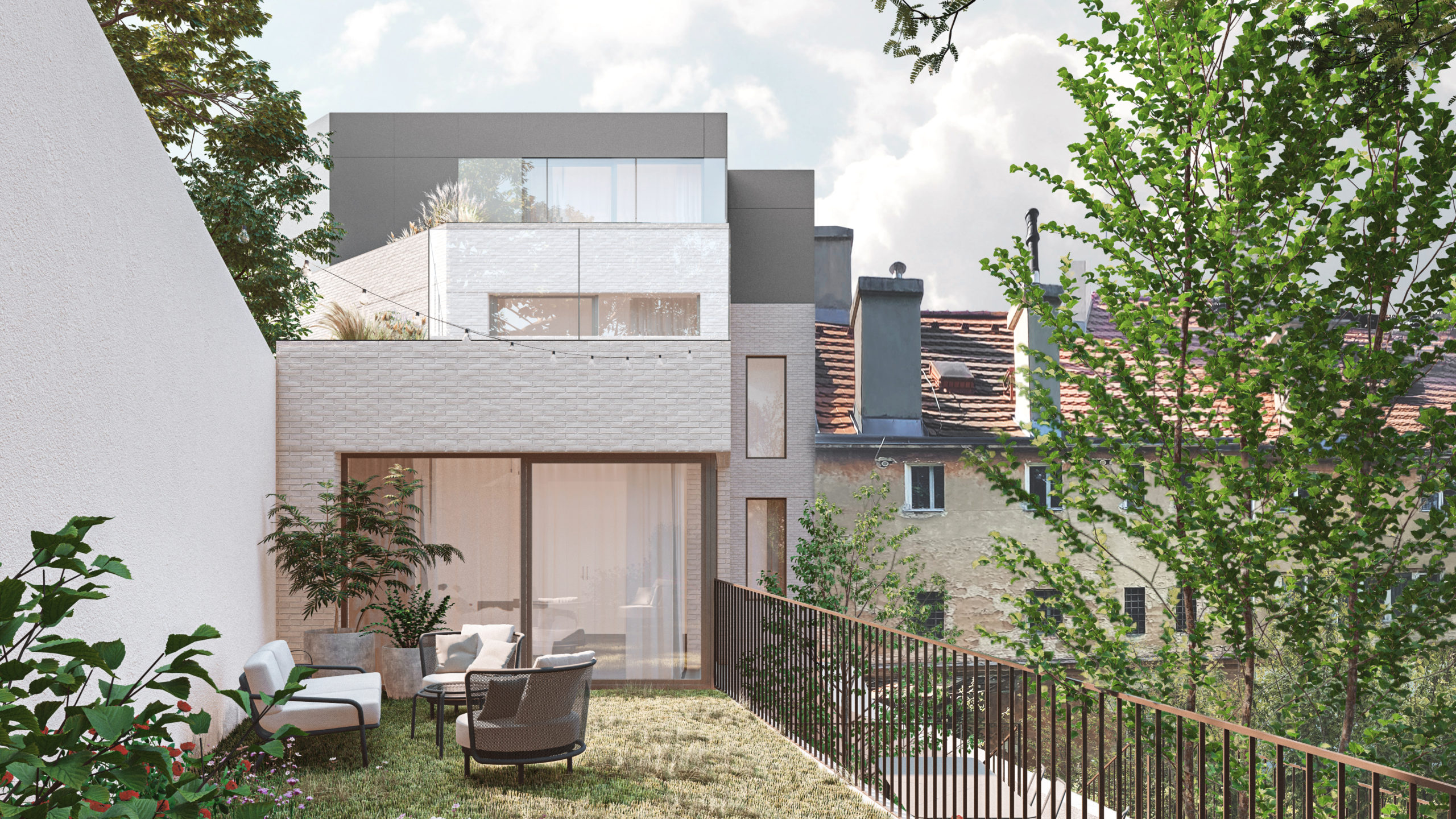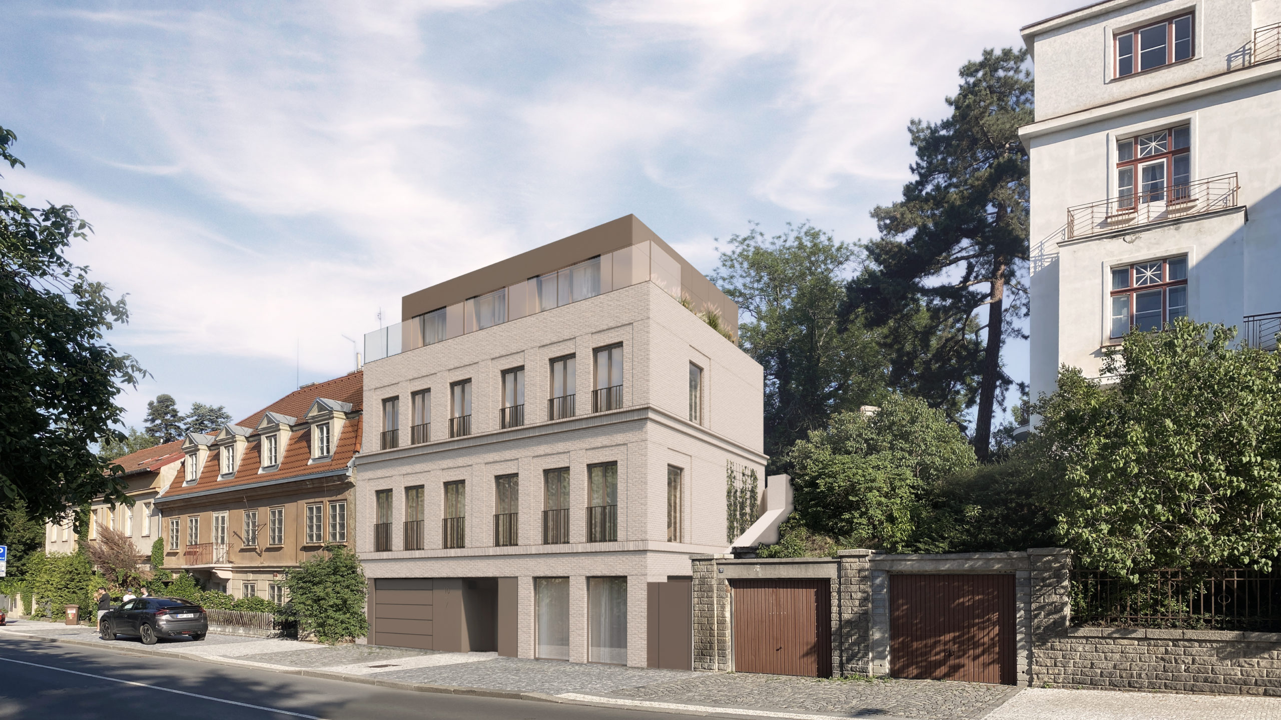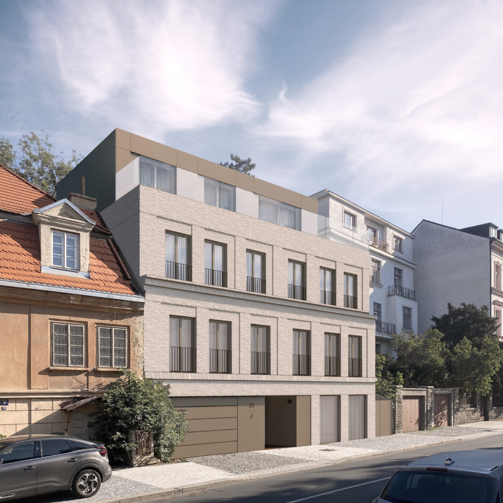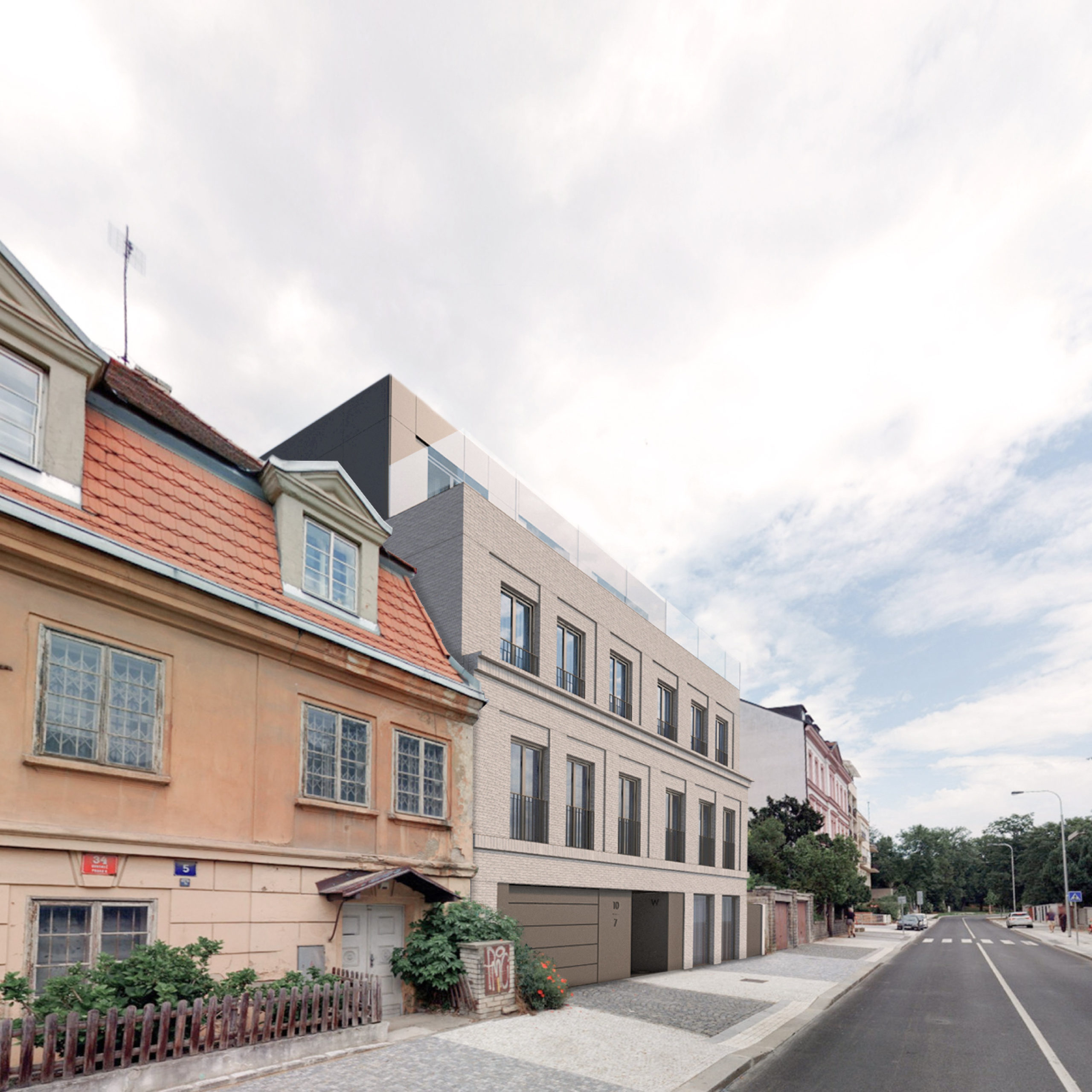 The design of a five-unit apartment building in Prague 6 fills a gap in Wolkerova Street, a site that was previously built up. The building is located in an urban area with diverse surrounding development, and its massing and expression respond to the character of the place. The individual floors are slightly set back so the house does not feel heavy and fits naturally into the street frontage. Emphasis was placed on the symmetry of the front façade, on referencing the historic context, and on ensuring that each apartment has its own outdoor space in the form of a terrace.
