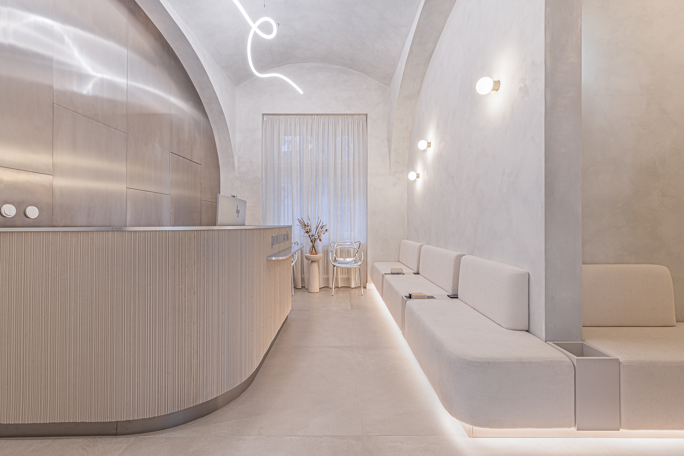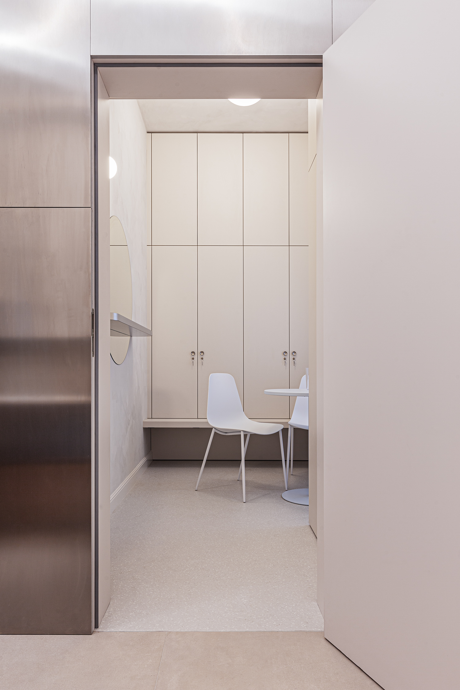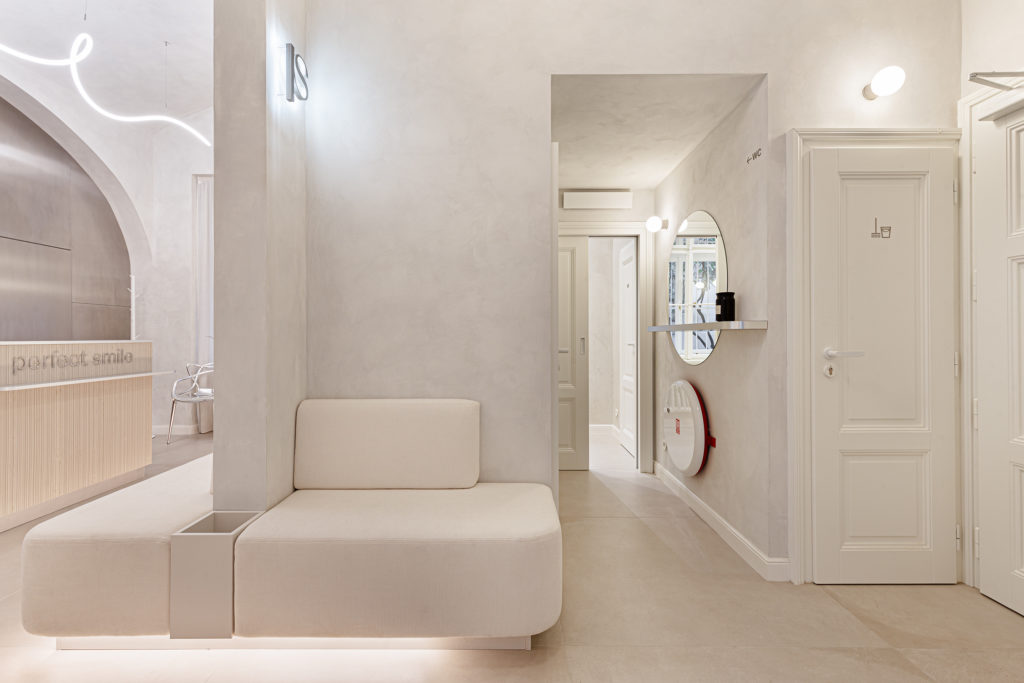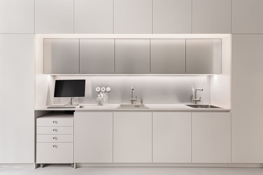 Custom carpentry elements are designed as compact units throughout the space, providing ample storage and meeting the functional requirements of the clinic. Design simplicity and clarity were a priority, so most of the furnishings are built-in and custom-made according to our designs. Light and reflective materials enhance the sense of openness, and carefully planned lighting further brightens the interior.