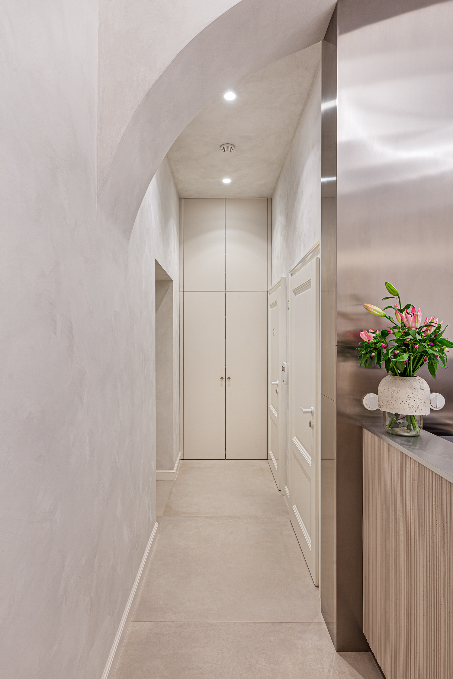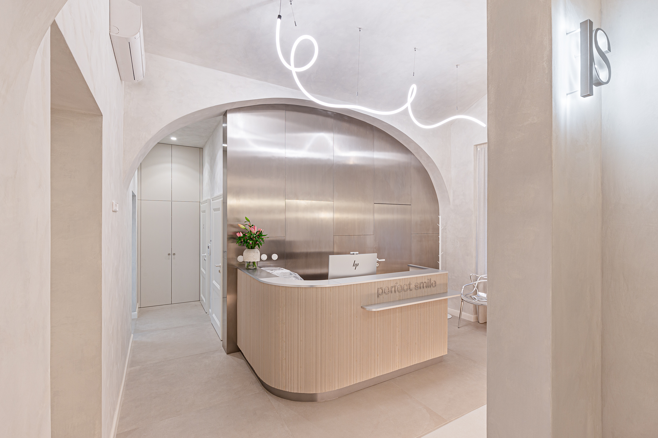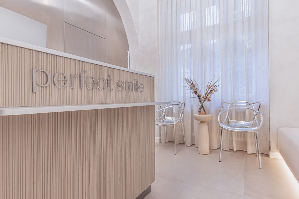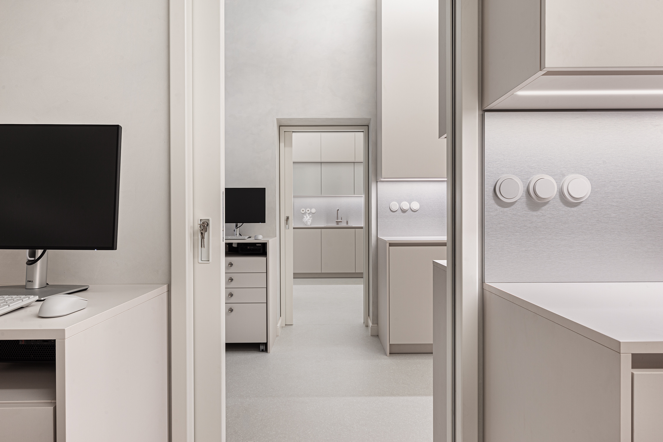 Custom carpentry elements are designed as compact units throughout the space, providing ample storage and meeting the functional requirements of the clinic. Design simplicity and clarity were a priority, so most of the furnishings are built-in and custom-made according to our designs. Light and reflective materials enhance the sense of openness, and carefully planned lighting further brightens the interior.