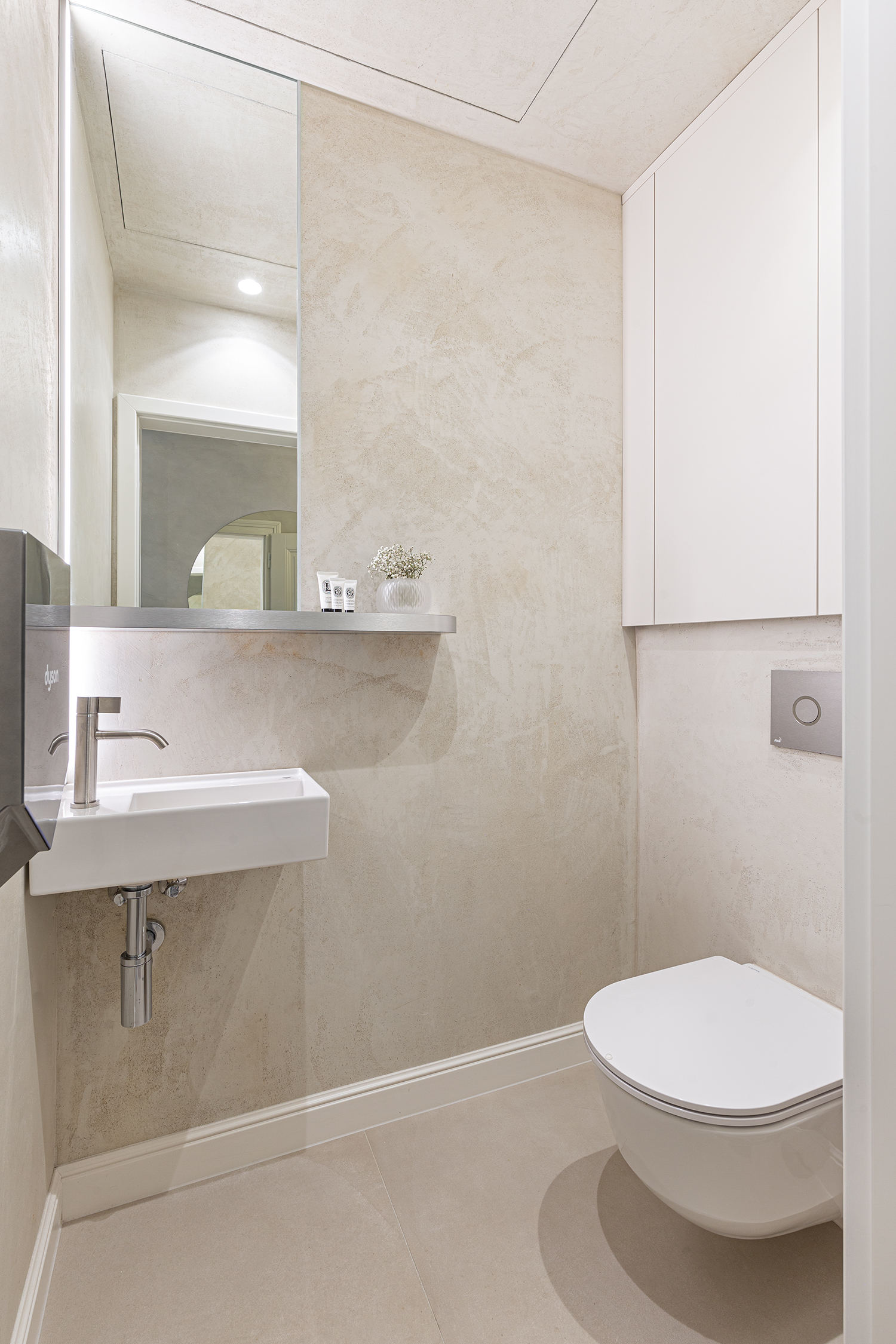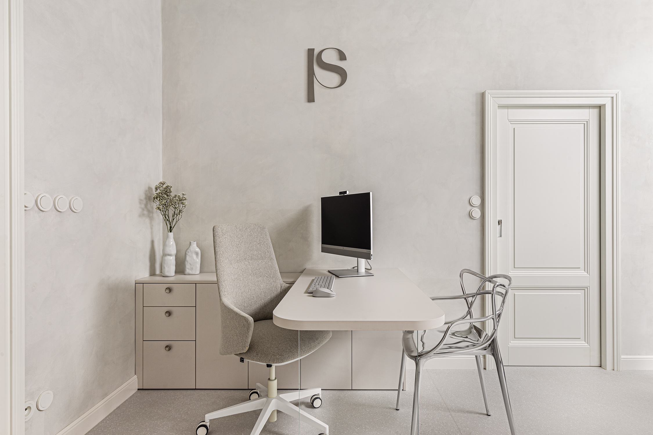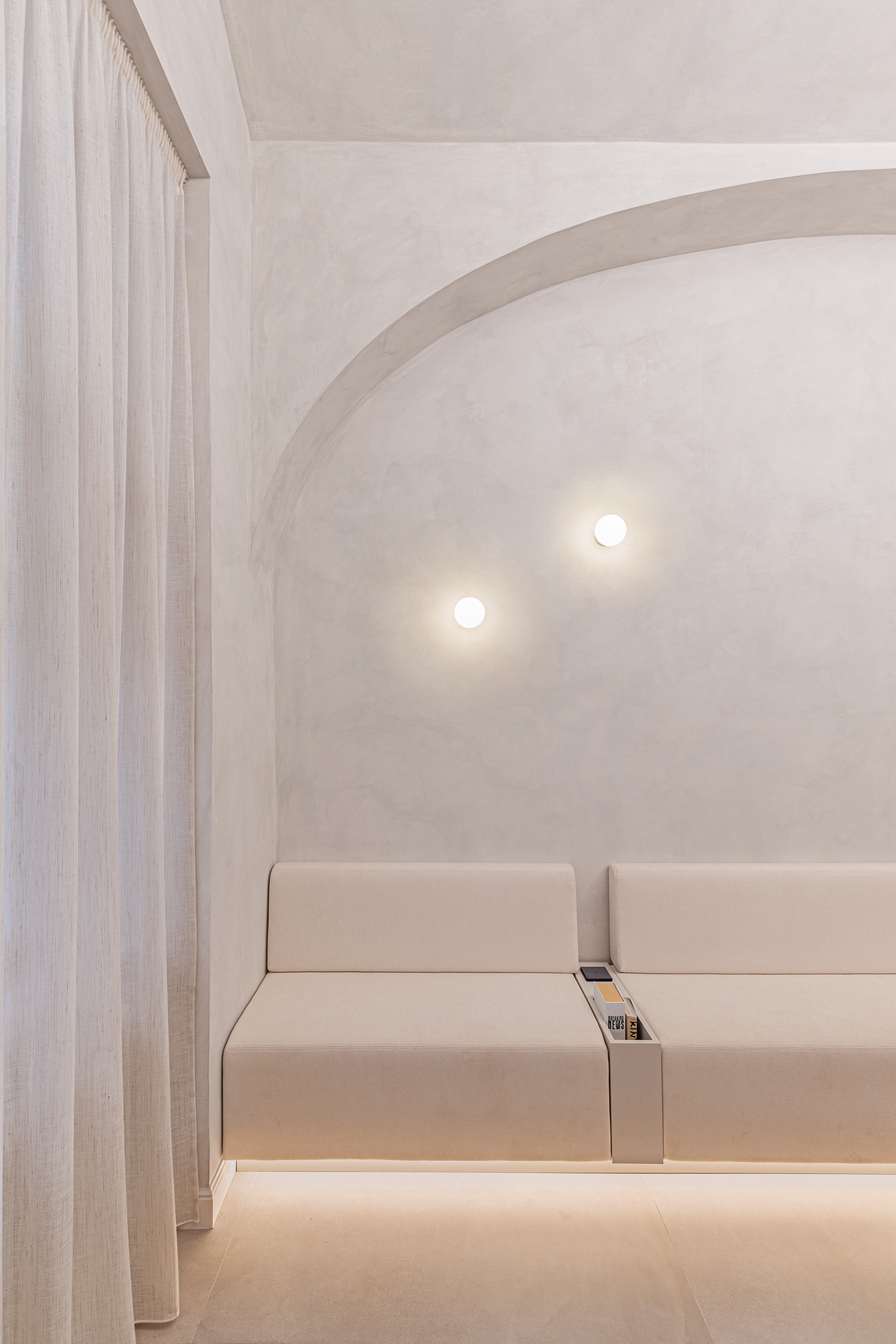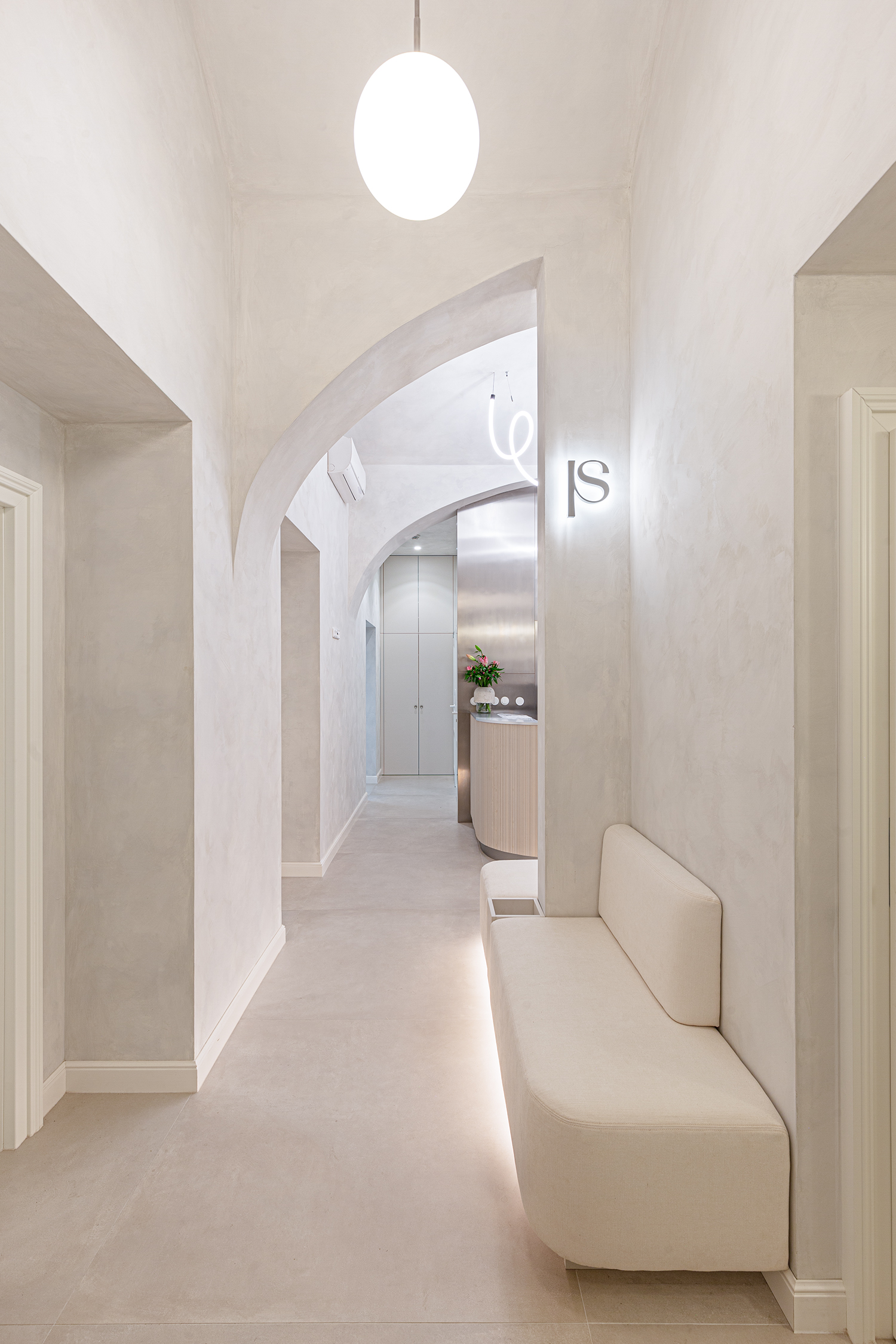 Custom carpentry elements are designed as compact units throughout the space, providing ample storage and meeting the functional requirements of the clinic. Design simplicity and clarity were a priority, so most of the furnishings are built-in and custom-made according to our designs. Light and reflective materials enhance the sense of openness, and carefully planned lighting further brightens the interior.