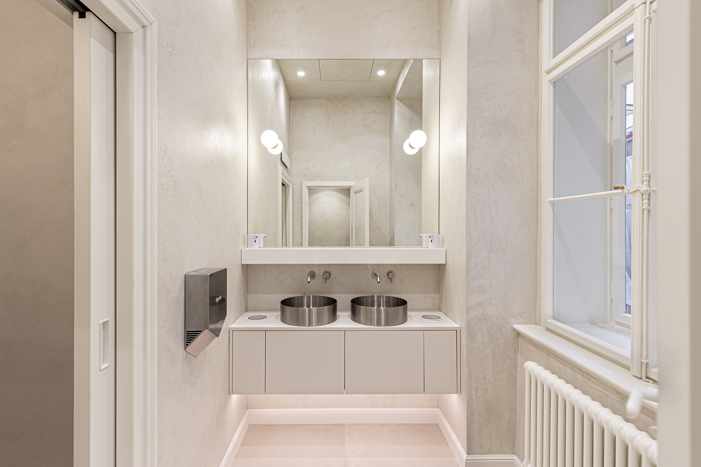 Considering the age of the building, all interior doors were designed as panel doors, reflecting the original historic style. Existing windows were preserved and refurbished, with missing parts of historic hardware replaced by replicas.