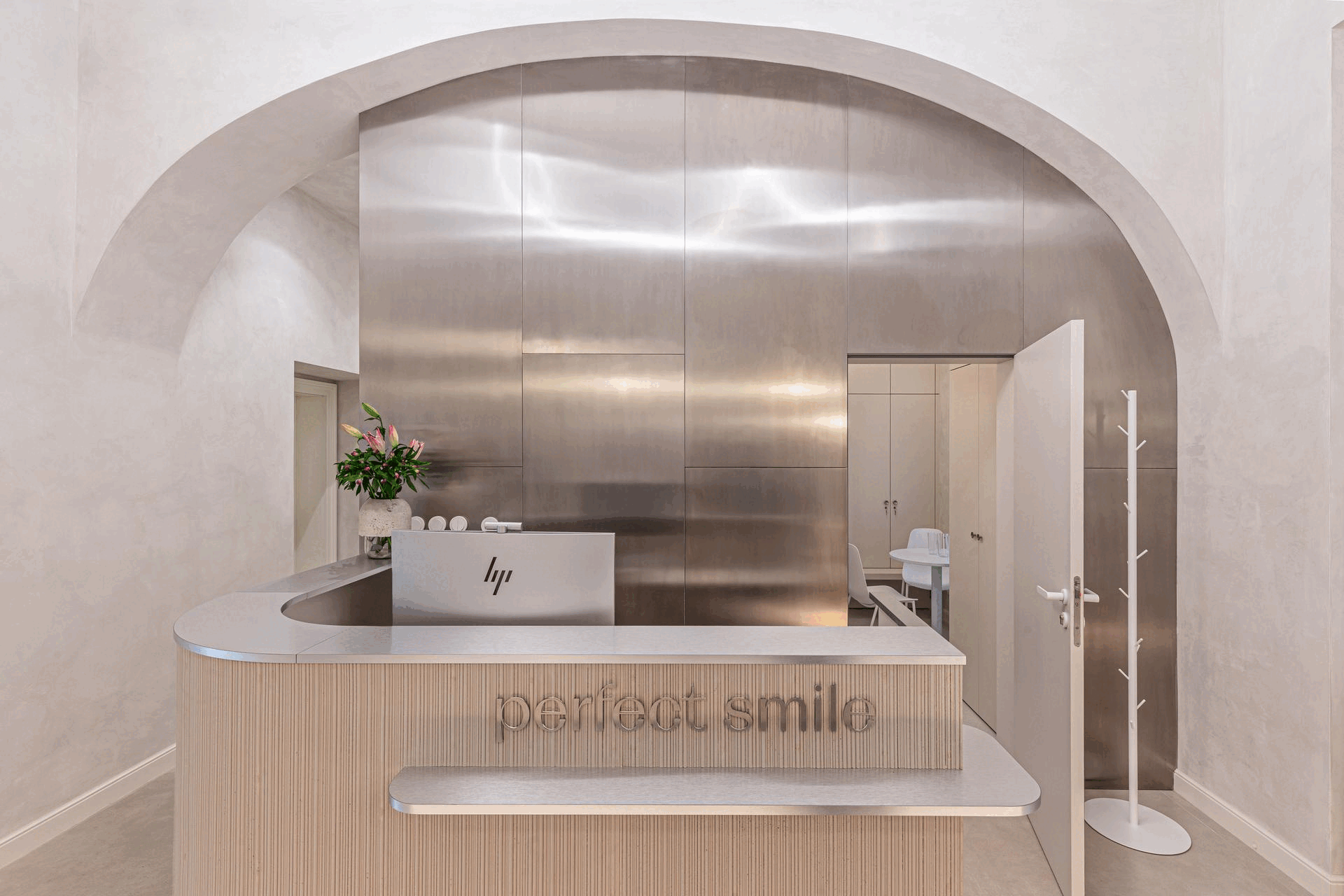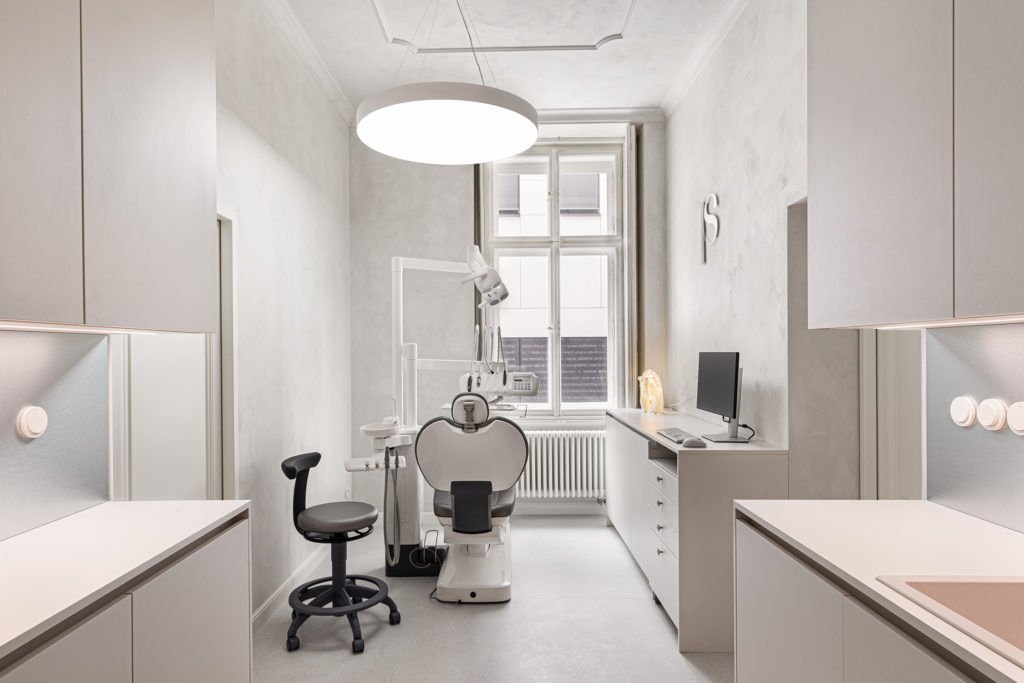 From the existing apartment on the ground floor, we designed an orthodontic clinic consisting of three separate treatment rooms, a reception with a waiting area, sanitary facilities, staff areas, a technical room, a cleaning room, and an X-ray room. To create the new sanitary facilities, the existing bathroom was divided into two toilets, a guest wash area, and a cleaning room. A corridor leads to the reception, where the waiting area was custom-designed. Behind the reception – which dominates the space not only with its volume but also with a structured cladding and a large wall covered with metal laminate – are the staff areas and one of the treatment rooms.