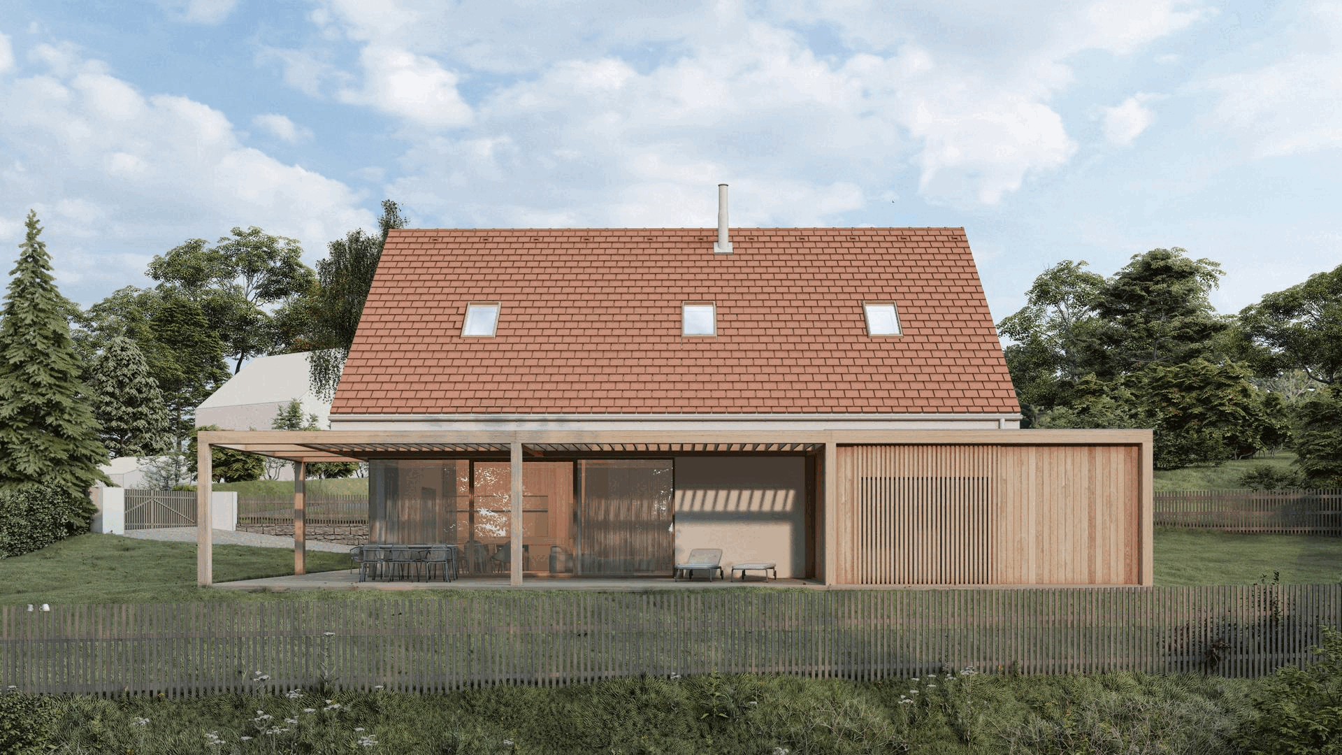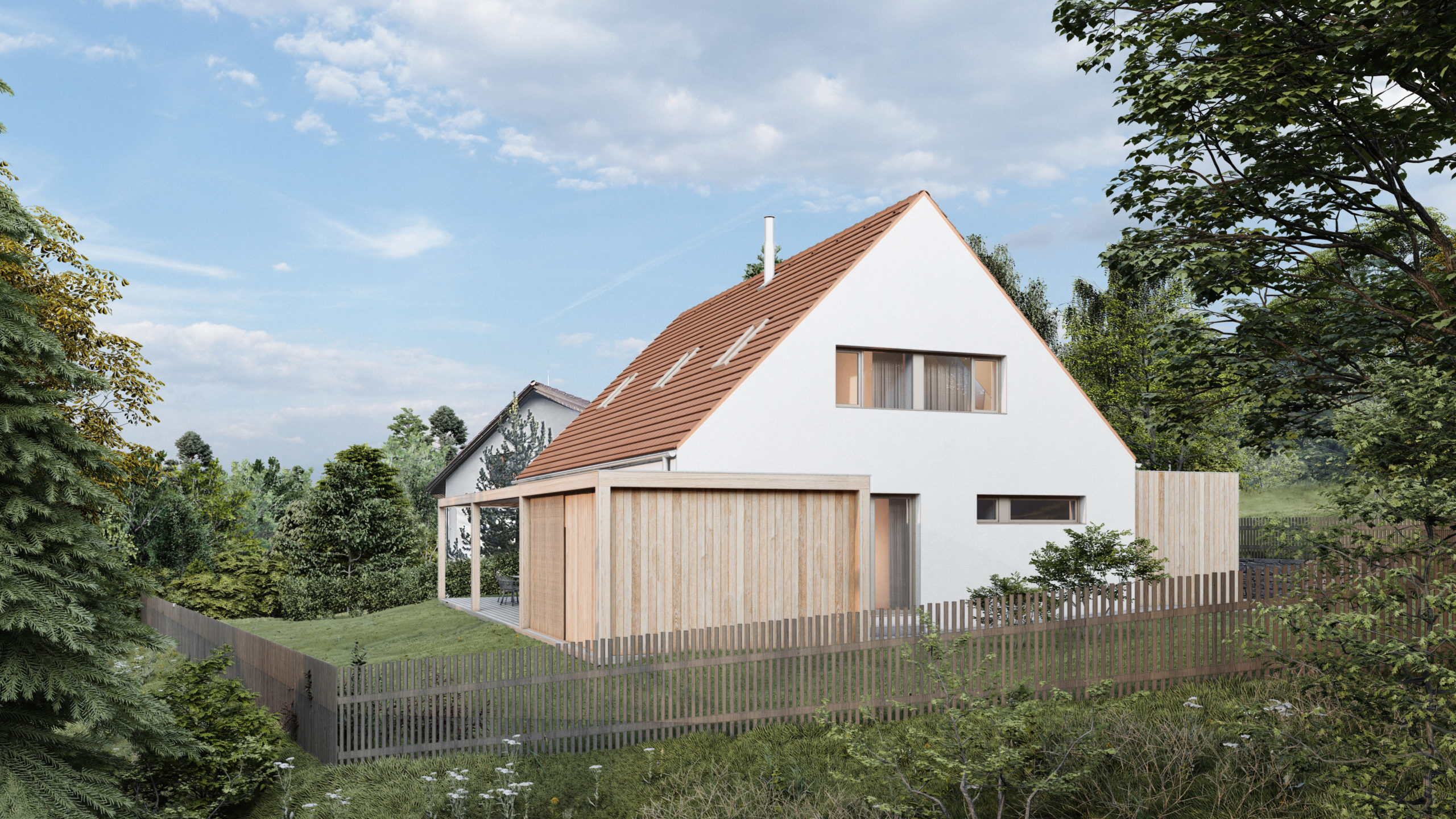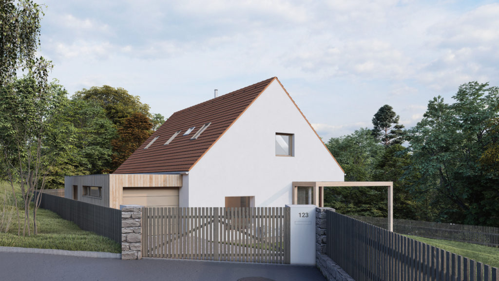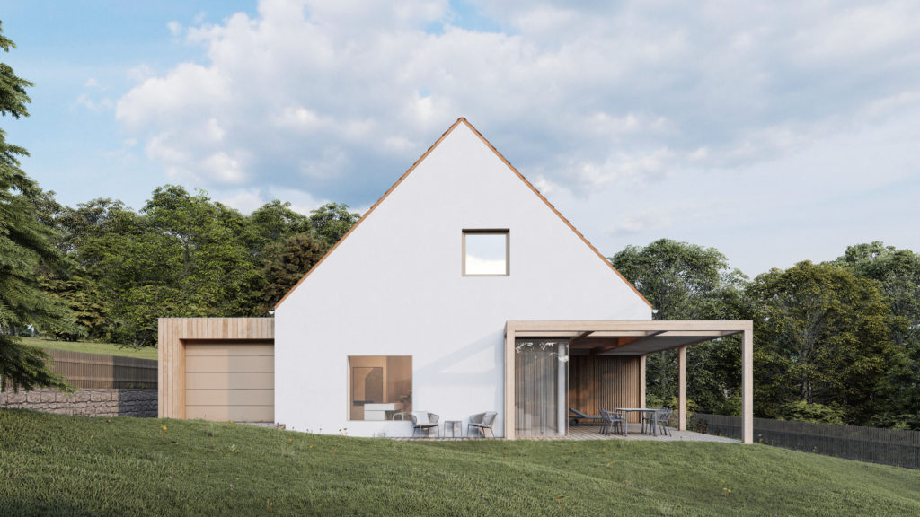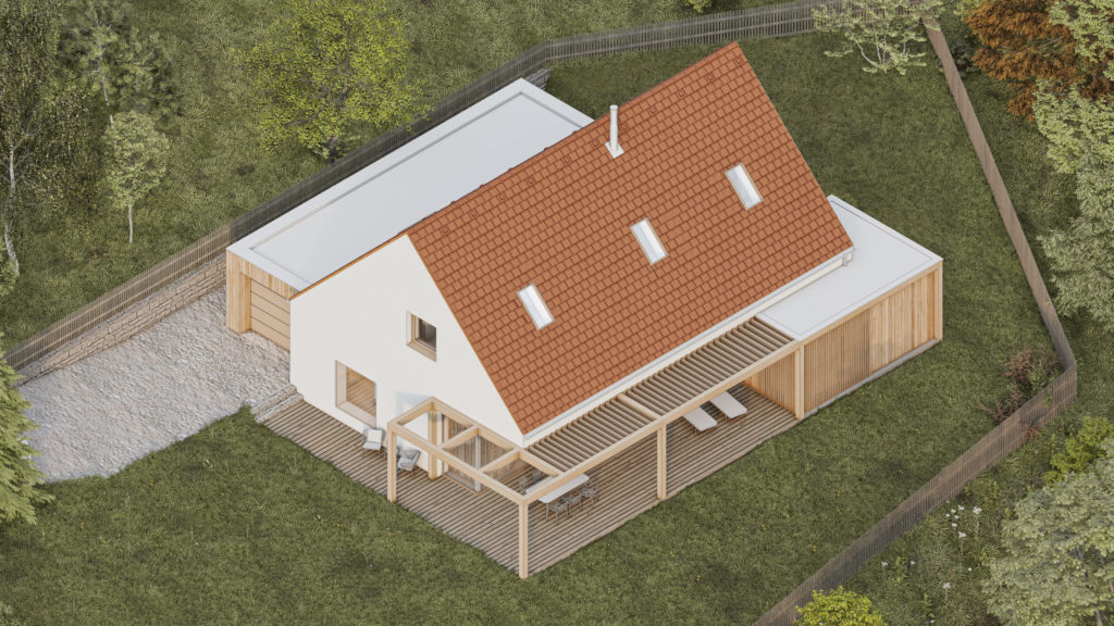 The building’s massing respects the traditional village context. The house features a conventional pitched roof complemented by modern architectural elements: a glazed corner with an extended roof overhang, a pergola, and a volume containing the entrance and garage. Thanks to the interior layout, the building is integrated into the sloped site, with the functional arrangement and massing stepping down toward the eastern boundary of the plot.