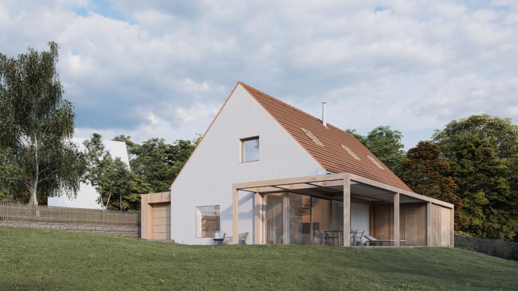 A traditional two-story family house in a small village in the Vysočina region. The ground floor is dedicated to a spacious living room with a kitchen and terrace. Following the sloped terrain, the living room is lowered by a few steps, creating a more open and airy connection to the garden. A single-flight open staircase within the living room serves as an interesting interior feature. The ground floor also includes a guest room, a bathroom, a wardrobe, and a utility room. On the second floor are the master bedroom with its own wardrobe and bathroom, two additional bedrooms, and another bathroom.