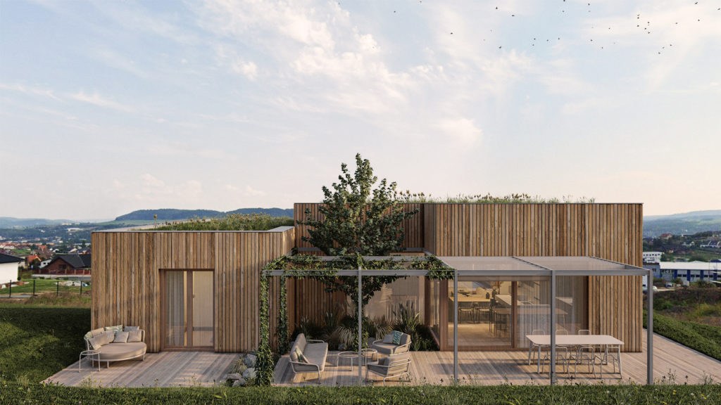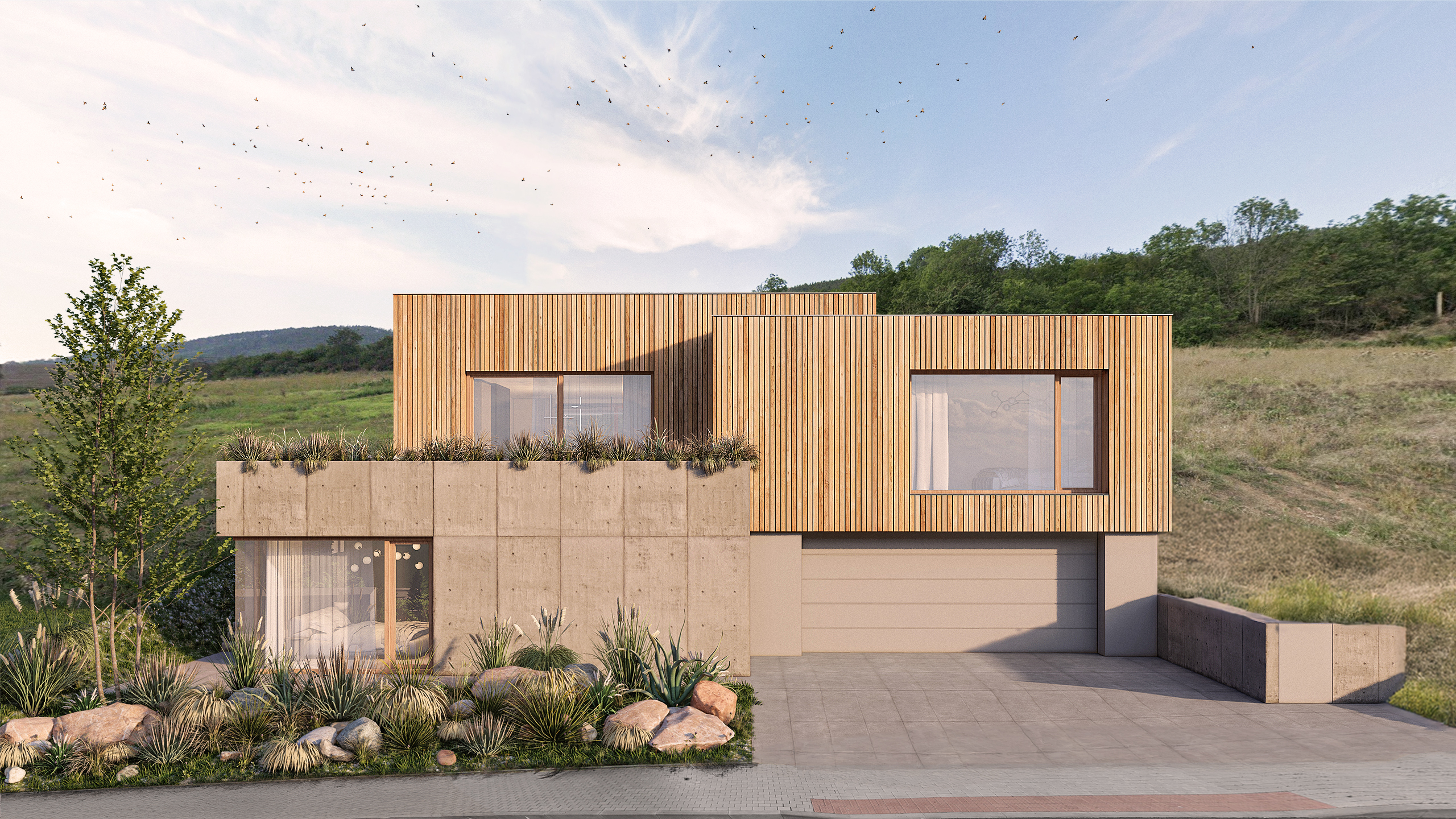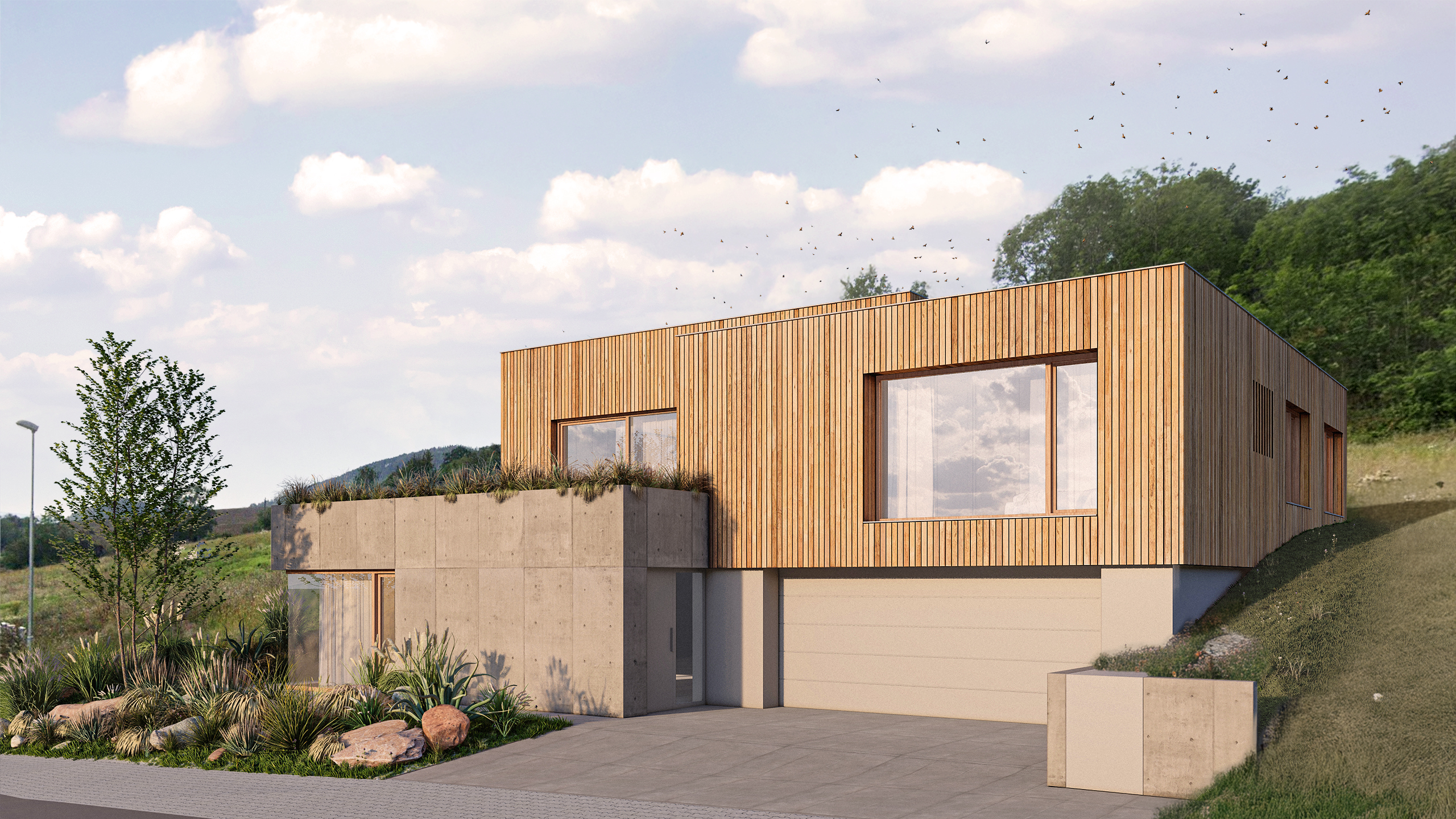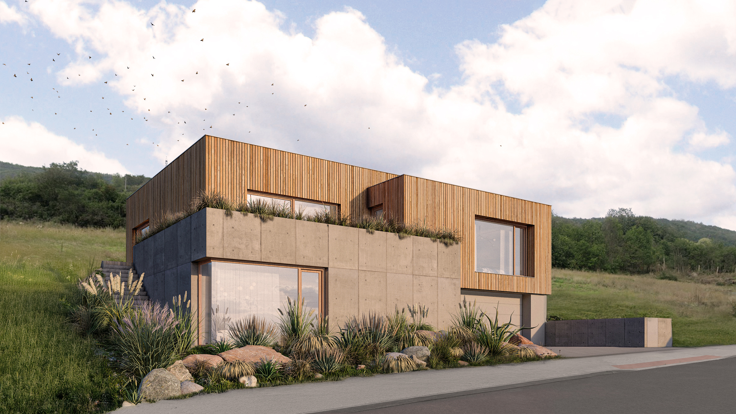 The house is composed of four volumes embedded into the slope, with their positions and materials reflecting the function of the interior spaces. The simple geometry is softened by greenery and large glazed surfaces. Materially, it combines raw concrete, natural wood, and a wooden terrace, which age naturally over time along with the house. The façades are complemented by wooden windows, precise detailing, and durable elements such as Alubond cladding and metalwork. The overall composition integrates naturally with the surrounding buildings.