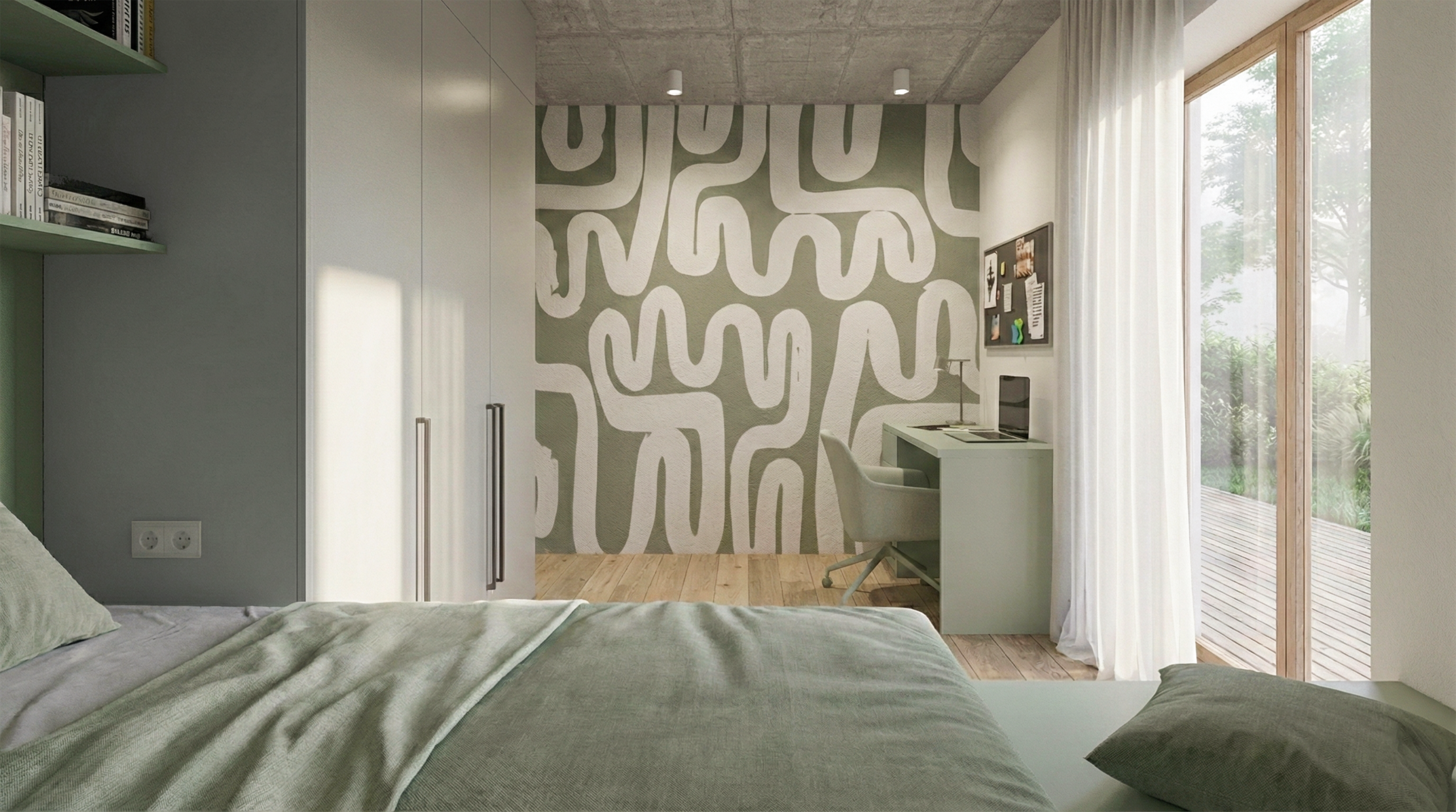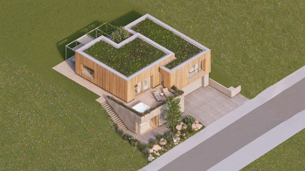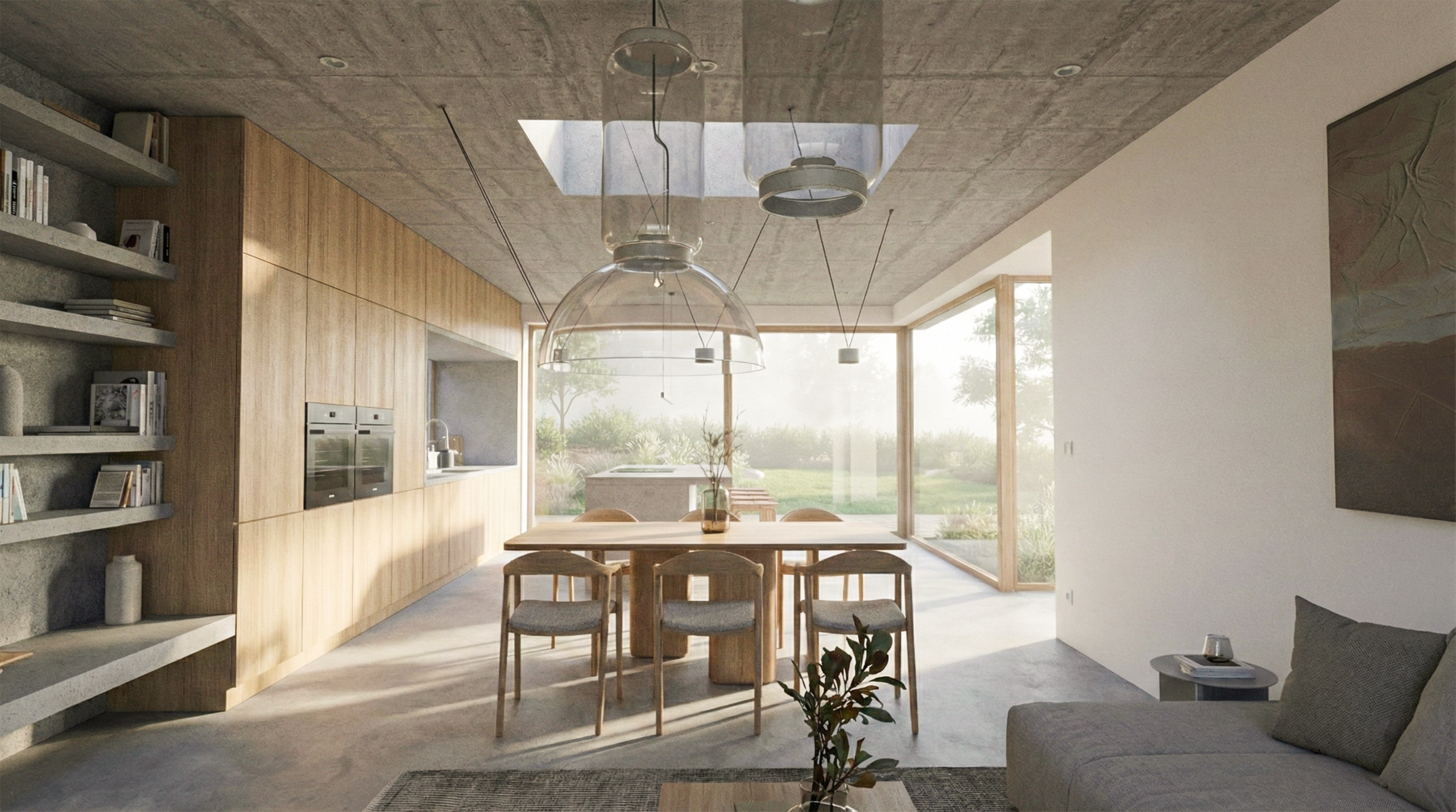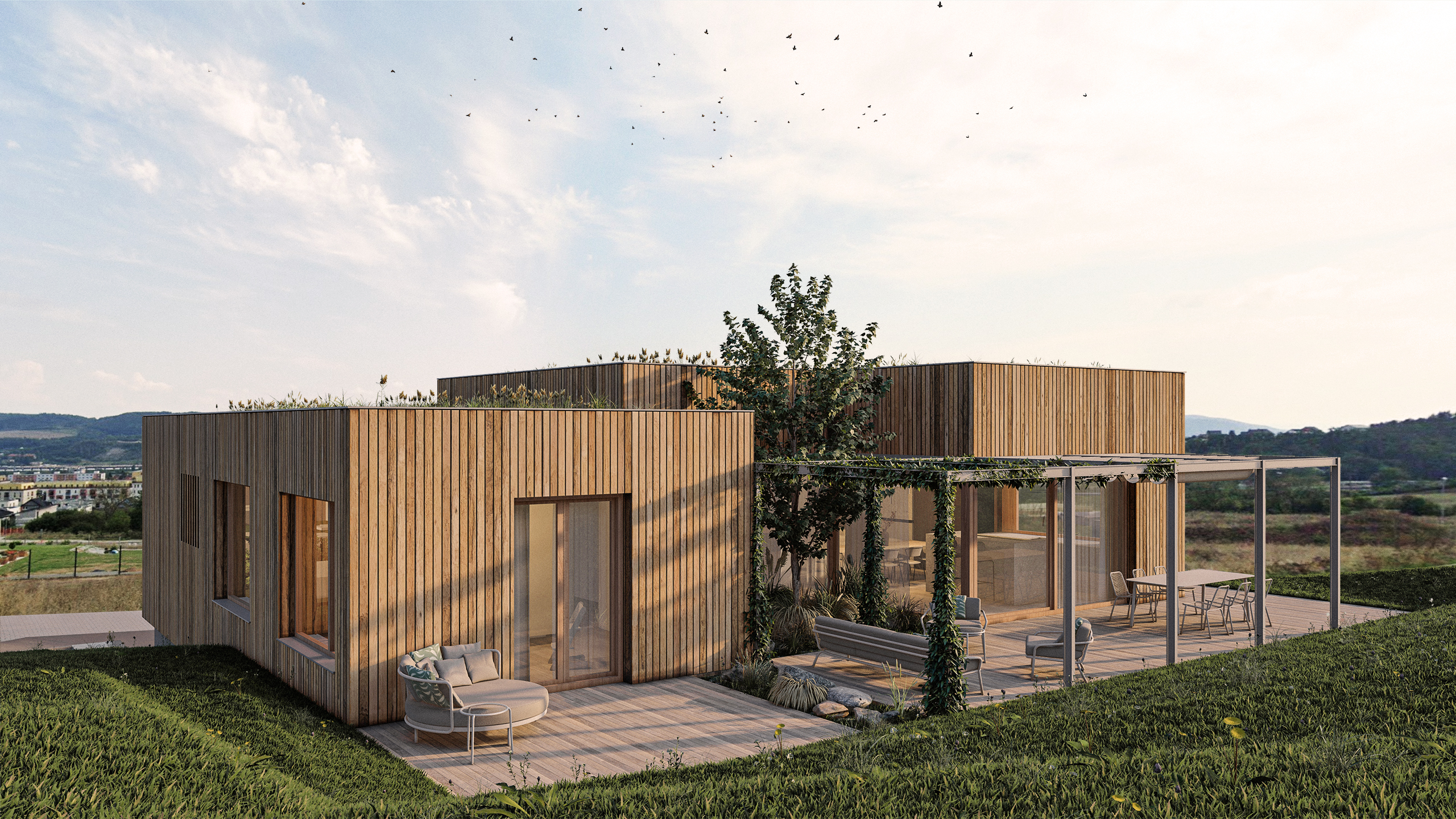 The house is composed of four volumes embedded into the slope, with their positions and materials reflecting the function of the interior spaces. The simple geometry is softened by greenery and large glazed surfaces. Materially, it combines raw concrete, natural wood, and a wooden terrace, which age naturally over time along with the house. The façades are complemented by wooden windows, precise detailing, and durable elements such as Alubond cladding and metalwork. The overall composition integrates naturally with the surrounding buildings.