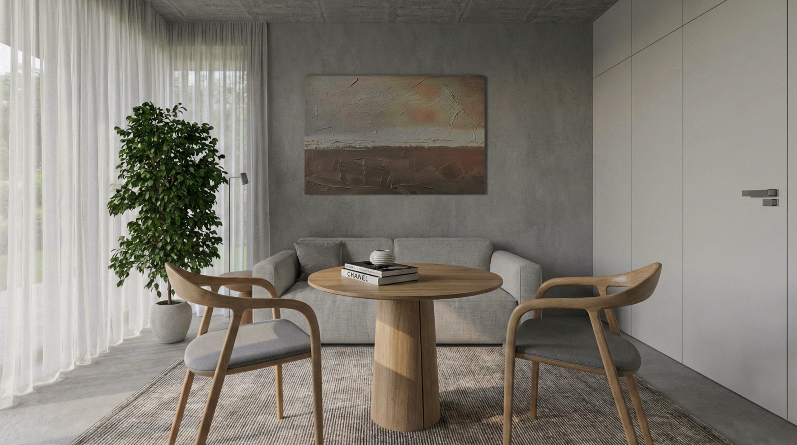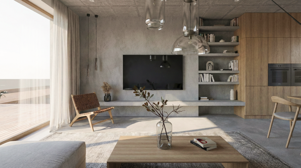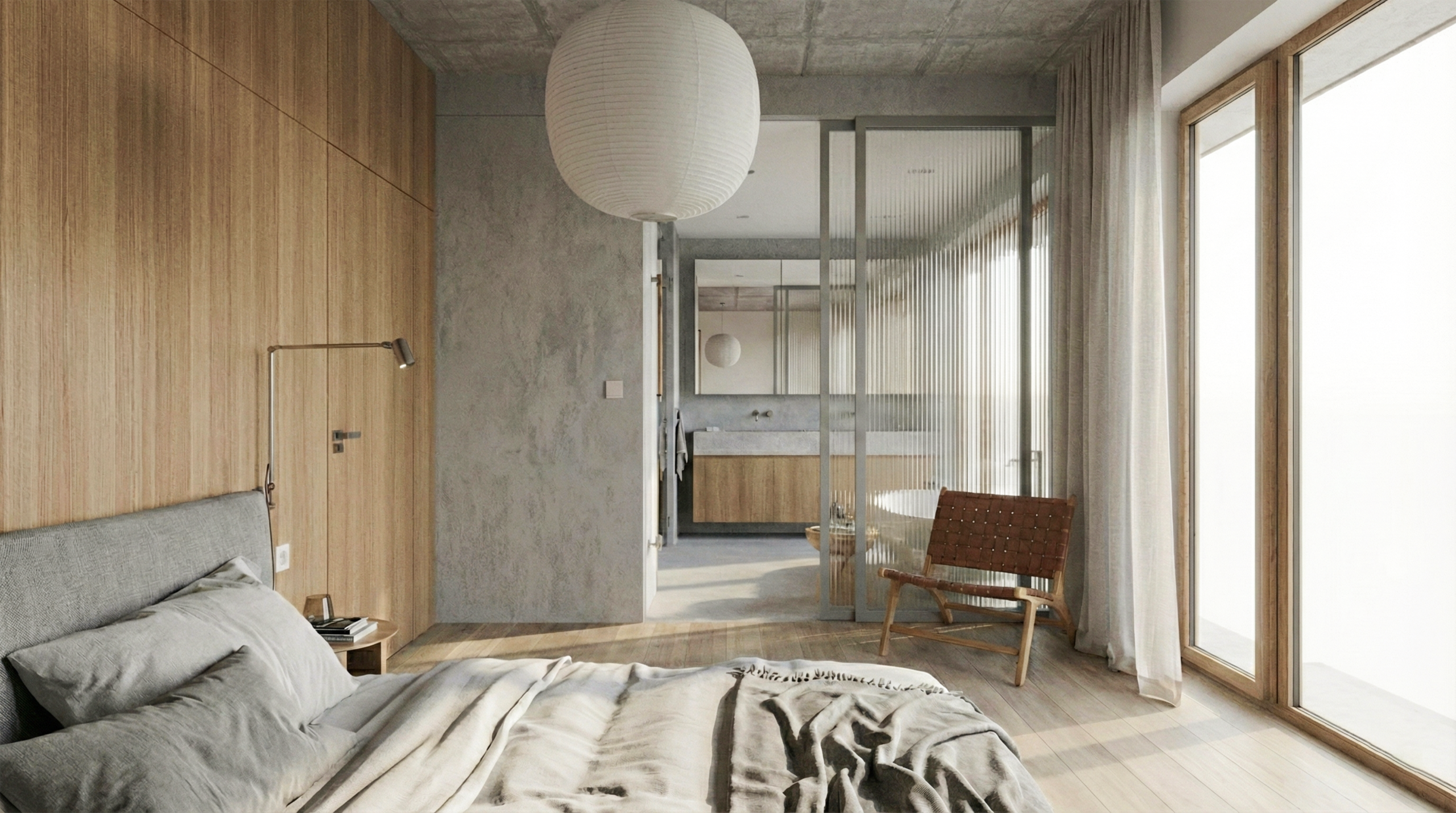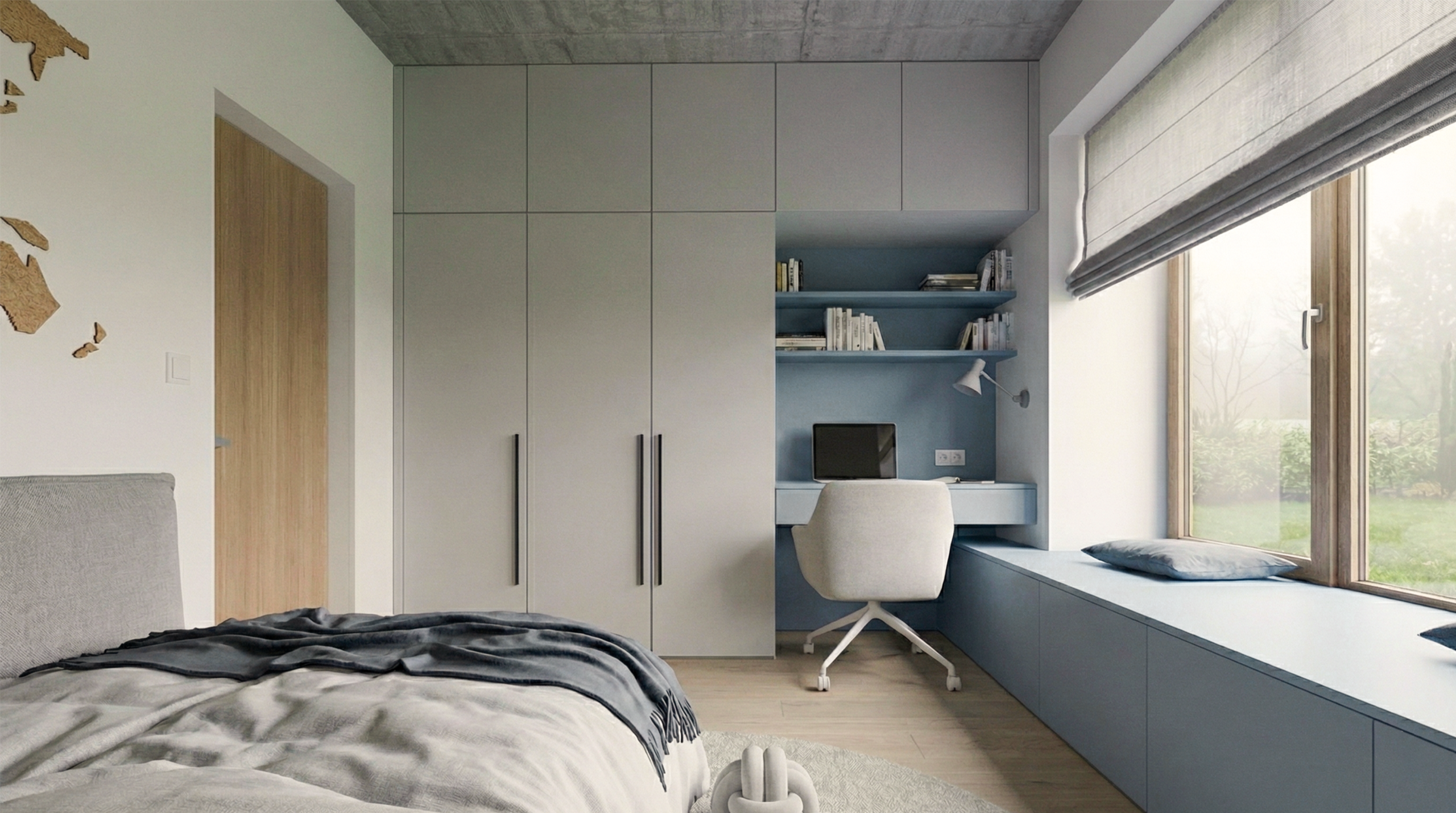 The house is composed of four volumes embedded into the slope, with their positions and materials reflecting the function of the interior spaces. The simple geometry is softened by greenery and large glazed surfaces. Materially, it combines raw concrete, natural wood, and a wooden terrace, which age naturally over time along with the house. The façades are complemented by wooden windows, precise detailing, and durable elements such as Alubond cladding and metalwork. The overall composition integrates naturally with the surrounding buildings.